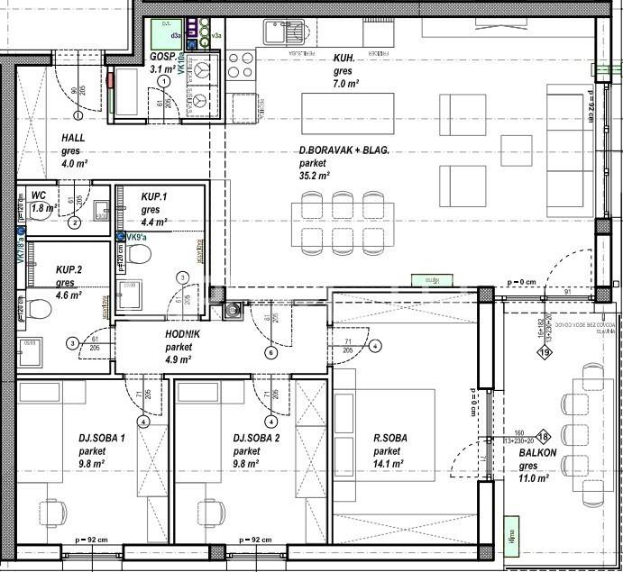PRODAJA, STAN, ČAKOVEC Prodaje se stan površine 98,70 m2 s balkonom površine 11,00 m2 na drugom katu niskoenergetske stambeno - poslovne zgrade na odličnoj lokaciji. Zgrada se sastoji od podruma, prizemlja, prvog, drugog i trećeg kata te sadrži ukupno 108 stambenih jedinica i 2 poslovna prostora. Moguć je odabir podnih obloga (keramika, parket ili laminat) te odabir unutarnje stolarije. Uz stan moguća je kupovina vanjskog parkirnog mjesta, garažnog mjesta bez spremišta ili garažnog mjesta sa spremištem. Za dodatne informacije stojimo na raspolaganju, a ovisno o načinu i količini plaćanja moguća je određena korekcija cijene.