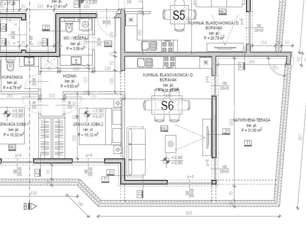 Dvosoban stan oznake S6 na 1. katu, sadrži: ulaz (3.20 m2), hodnik (6.00 m2), dnevni boravak s blagovaonicom i kuhinjom (25.50 m2), dvije spavaće sobe (10.10 m2 i 10.10 m2), kupaonicu (4.80 m2), WC/praonicu (3.50 m2) i natkrivenu terasu (35,00 m2). Ukupna stambena površina iznosi 80,70 m2. Stanu pripadaju dva vanjska parkirna mjesta i ostava u podrumu zgrade (4,40 m2). Ukupna površina stana i svih pripadaka iznosi 85,66 m2.