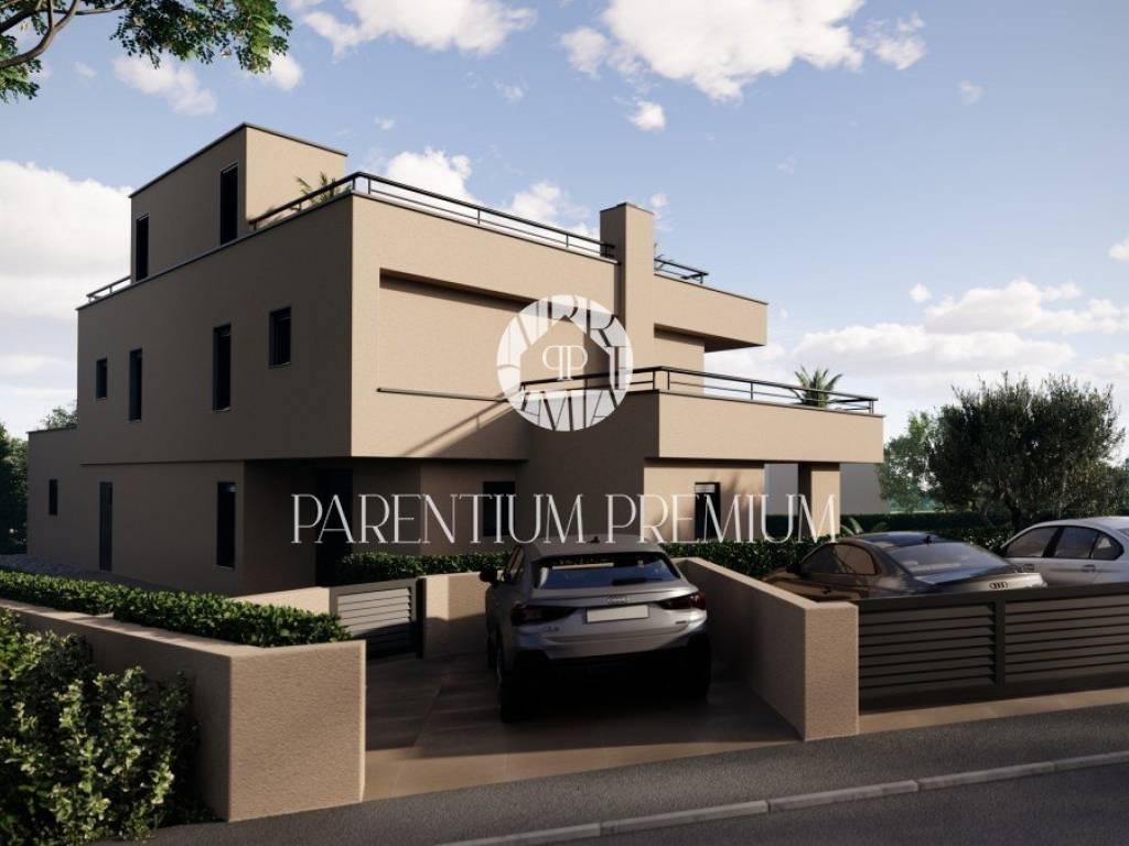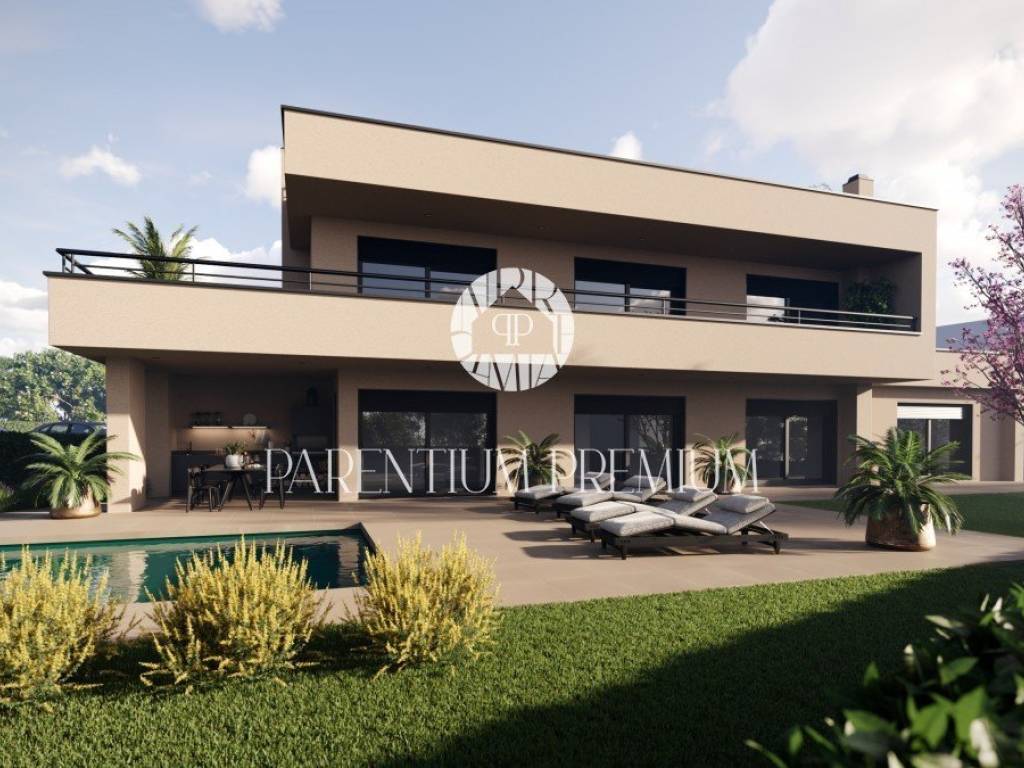 This imposing modern villa with a pool of a total area of brutto 307 m2 netto 263.6m2 with a large roof terrace of 97.1m2 is located in a place with all amenities.