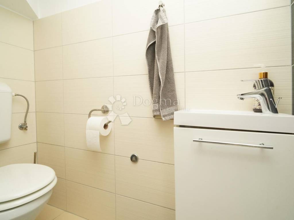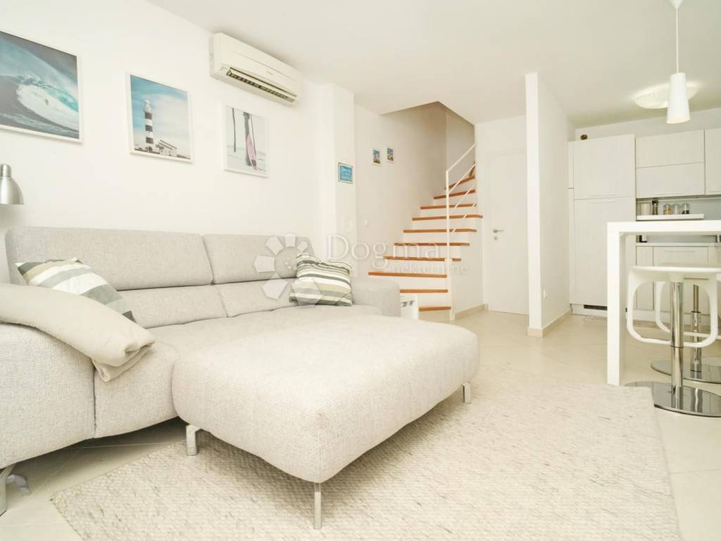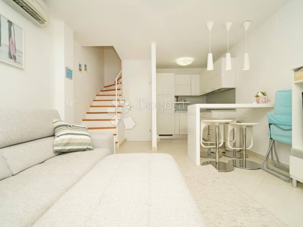 The apartment has a total area of 60 m distributed over two floors and offers excellent functionality and comfort. On the ground floor there is a bright living room connected to the kitchen and dining area, a guest toilet, and access to the terrace. On the upper floor there is a bedroom, a bathroom, and a balcony with an open sea view, which gives special value to this property.