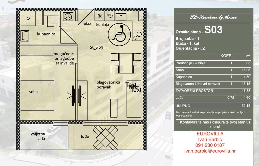 Trogir, novogradnja jednosoban stan od 53,68 m2 prvom katu s pogledom na moreJednosoban komforan stan u novogradnji na prvom katu ukupne korisne površine 53,68 m2, koji se sastoji se od: dnevnog boravka, kuhinje s blagovaonicom spavaće sobe, kupaonice, predsoblja te lođe na koji se izlazi iz dnevnog boravka.Ukupna površina stana iznosi 51,88 m2, od čega je zatvorena stambena korisna površina stana 47,55 m2 uz lođu 6,13 m2 koji se nalazi na zapadu. Neto korisna površina 52,15 m2Uz kupnju stana je obvezna kupnja jednog garažnog parkirnog mjesta u podzemnoj garaži po cijeni 20.000 EUR, uz lift iz garaže.Orijentacija stana je istok- zapad uz dosta svjetla i obolje sunca što će dodatno učiniti dati na komforu i življenja u nekretnini.Za više informacija stojim Vam na raspolaganju na navedenim kontaktima... Više na eurovilla.hr, ID: 548360