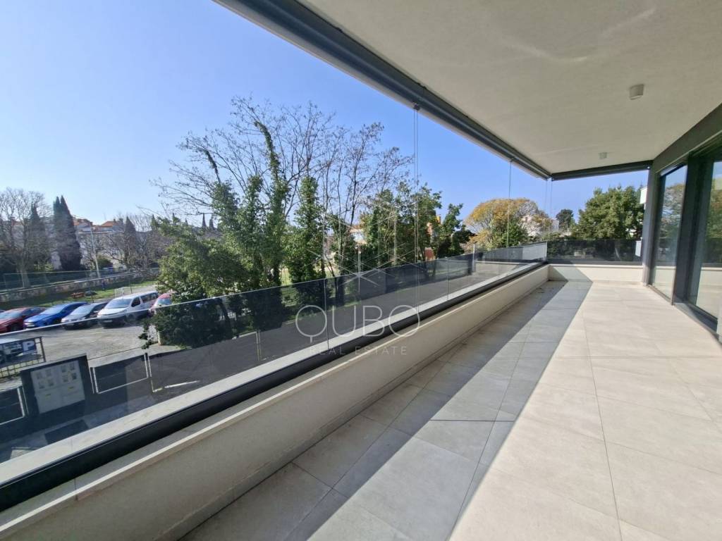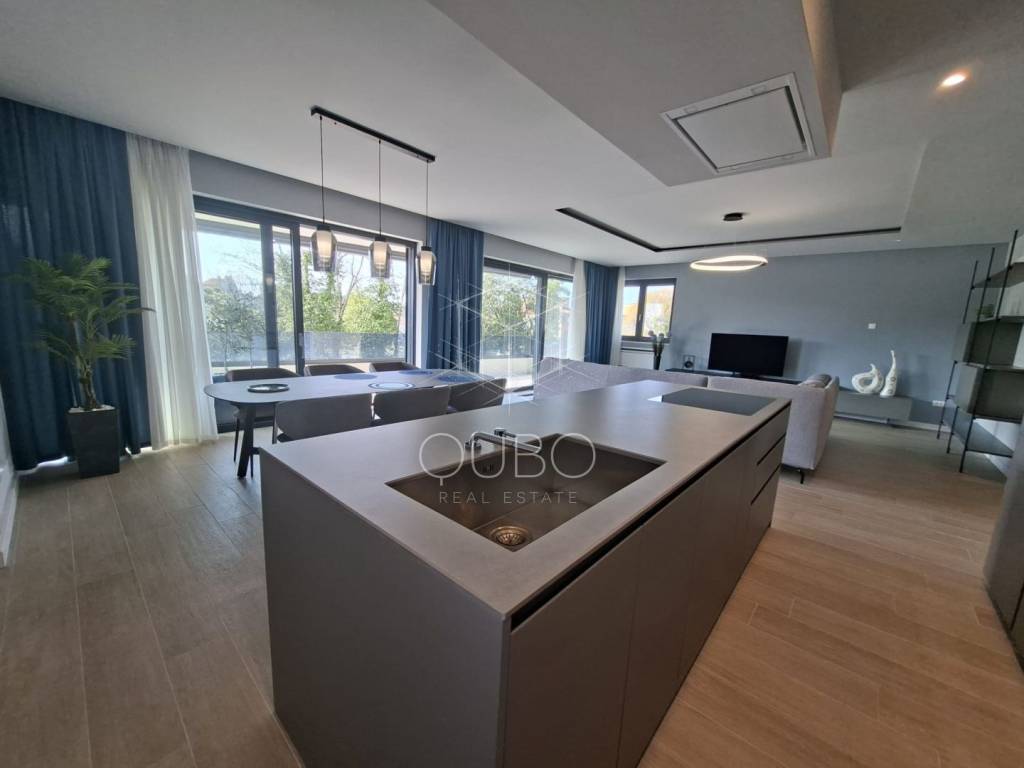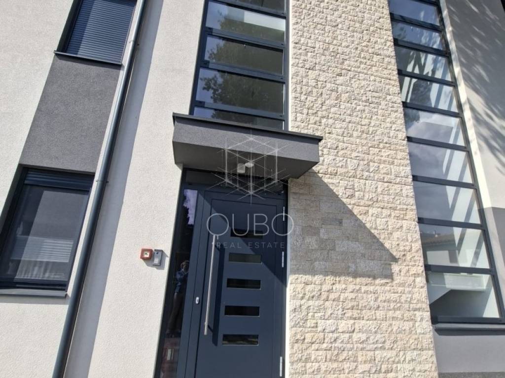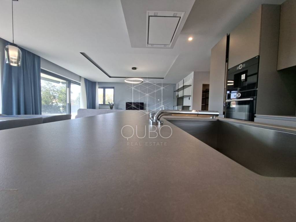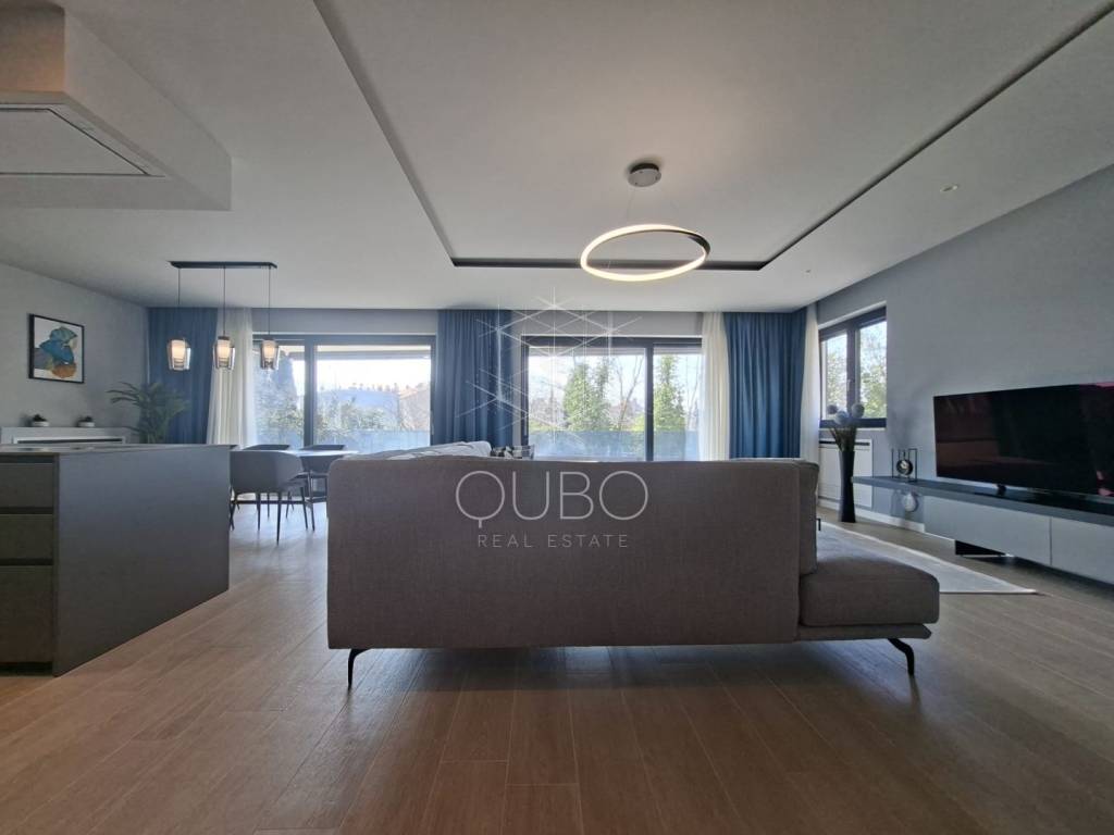 The apartment is located on the first floor of a newer residential building and is designed as a spacious, representative living space. Its central area consists of an open-plan living room, kitchen and dining area, arranged in a modern concept that emphasises light, openness and connection with the exterior. Large glass walls extend the living area onto a covered terrace of 21.50 m², creating an ideal setting for relaxing, entertaining and enjoying outdoor living. In addition, the apartment also features another covered terrace of 3.70 m².