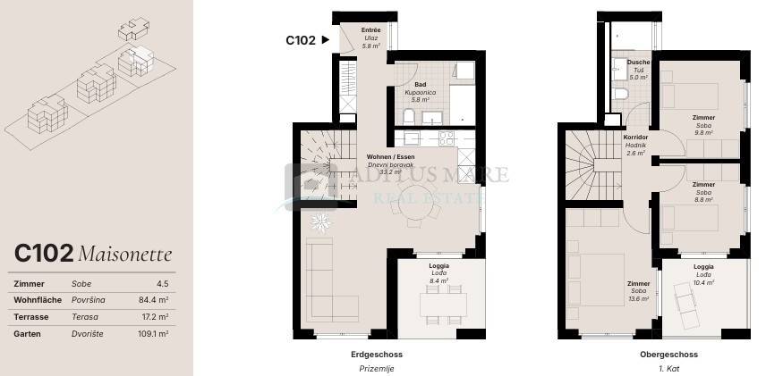 Dvoetažni stan C102ukupne stambene površine 84,4 m, koji uz stambeni prostor nudi i terase površina 17,2 m te privatni vrt površine približno 110 m, što ovoj nekretnini daje iznimnu vrijednost i osjećaj života u kući. U vrtu je predviđen bazen i uređen mediteranski okoliš, savršen za uživanje i opuštanje tijekom cijele godine.