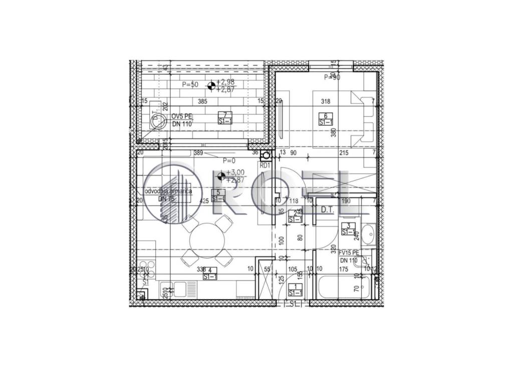 Two-bedroom apartment on the second floor of a new building with an elevator in the center of Zaprešić, NKP 47.27 m2. The building has three floors and there are a total of 34 apartments in the building. It consists of an entrance, a living room with a kitchen and a dining room with access to a loggia, a bedroom and a bathroom with a toilet. The apartment is oriented to the northeast. The same apartment is also available on the first floor.The apartments in the building will be equipped to high standards, aluminum joinery, electrically adjustable aluminum blinds, three-layer glass, the first glass of which is stopsol (reflective colored glass that reflects the sun's rays). The heating and cooling system is the latest and highest quality variant of heat pumps, which, with additional thermal insulation from rock wool (15 cm), result in savings of up to 70% compared to a classic heating system. It is possible to buy a garage space with the apartment, but it is not a requirement.