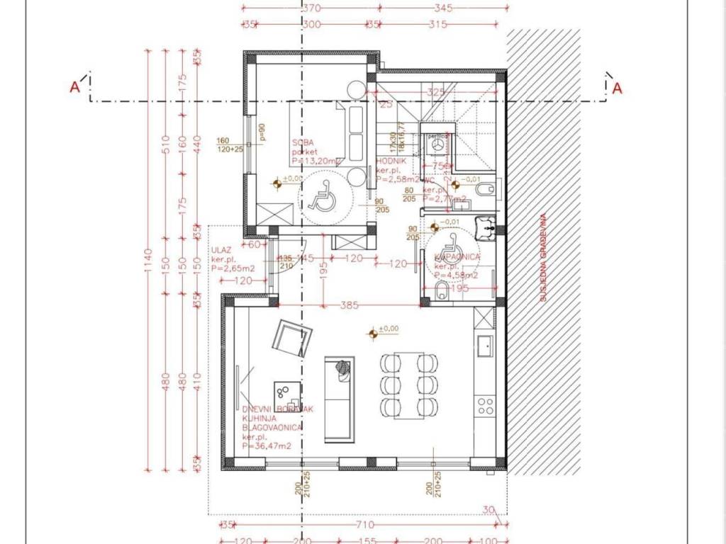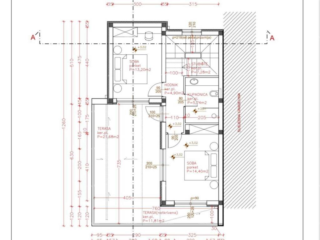 Layout: Ground floor: spacious living room, one bedroom, bathroom. First floor: two bedrooms, bathroom, large open terrace of 20 m.