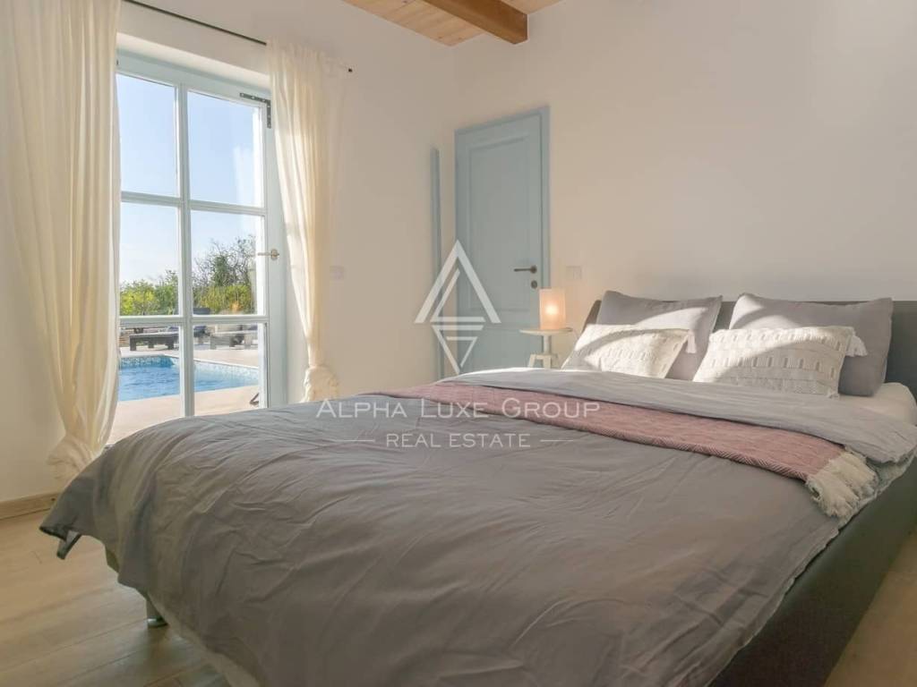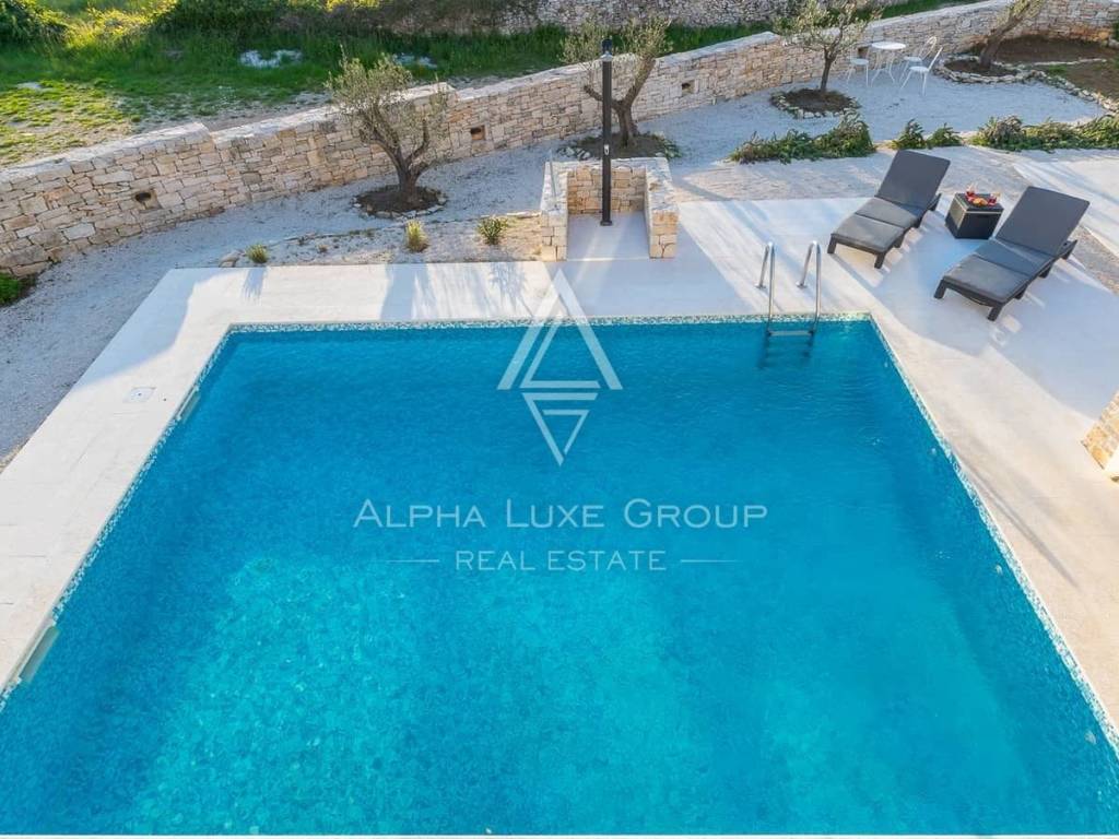 The property is situated on a 758 m² plot and features a beautifully arranged outdoor area designed for enjoying the Mediterranean climate. The spacious sun terrace and a 39 m² swimming pool create a perfect setting for relaxation, while the covered summer kitchen provides an ideal space for outdoor dining and gatherings with family and friends.