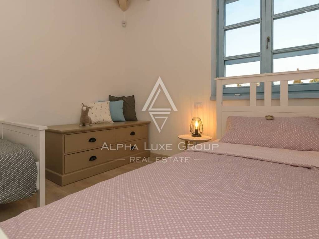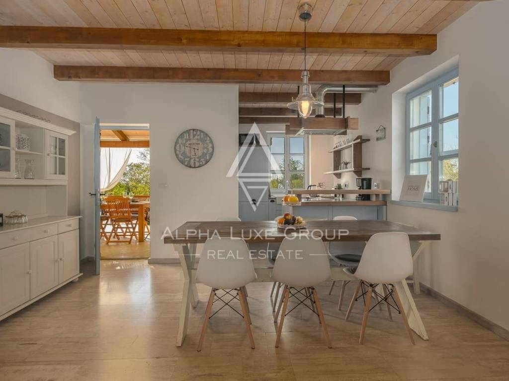 The house offers approximately 179 m² of comfortable living space and is decorated in a warm coastal Mediterranean style that creates a welcoming and elegant atmosphere. The interior layout includes four comfortable bedrooms and four bathrooms, ensuring privacy and comfort for residents and guests. The main living area includes a bright living room with a working fireplace, a dining area, and a fully equipped kitchen designed for everyday functionality and entertaining.