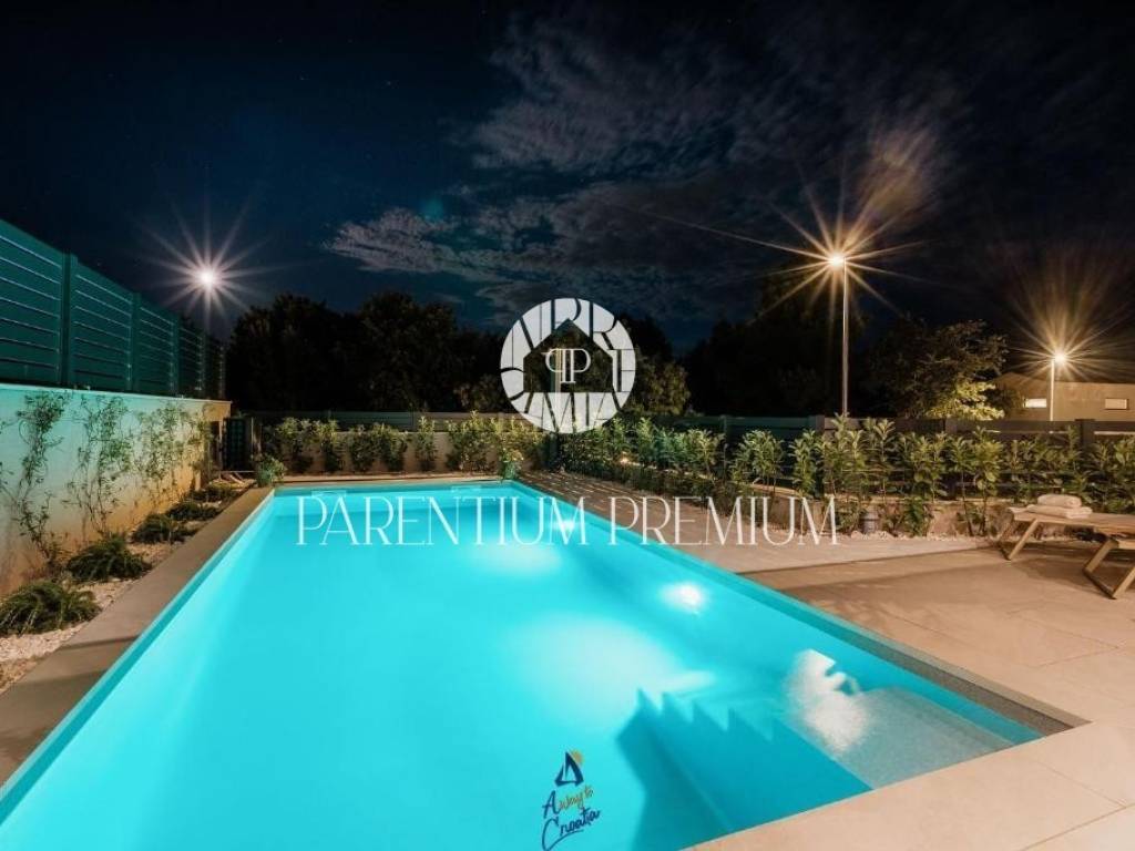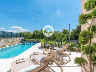 The villa consists of 2 floors. On the ground floor we have a small entrance hall from which we enter the open space part where the living room, kitchen and dining room are located. From this part you can access a spacious covered terrace with a summer kitchen connected to the sun deck and heated pool. On this floor there is also a bedroom, a bathroom and a technical room on the outside. Upstairs there are 2 bedrooms with private bathrooms and a large shared terrace.