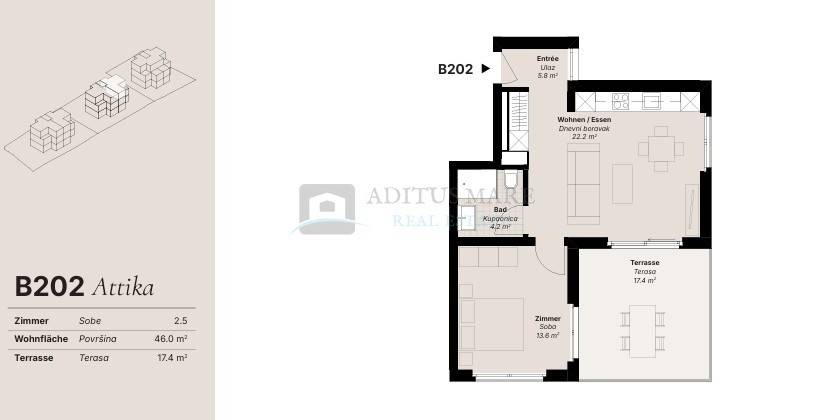Stan B202ukupne stambene površine 46 m, koji uz stambeni prostor nudi i terasu površina 17,4 m što ovoj nekretnini daje iznimnu vrijednost.