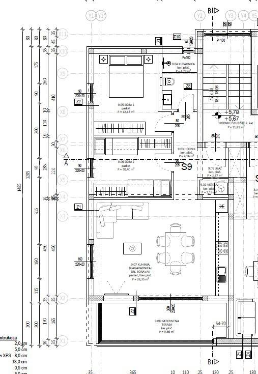 Dvosoban stan oznake S9 na 2. katu, s krovnom terasom, a sadrži: hodnik (2,87 m2), dnevni boravak s blagovaonicom i kuhinjom (28,35 m2), dvije spavaće sobe (12,12 m2 i 10,40 m2), kupaonicu (4,29 m2), WC/praonicu (1,19 m2) i natkrivenu terasu (9,86 m2). Ukupna stambena površina iznosi 66,62 m2. Stanu pripada vlastita krovna terasa površine 77 m2 s koje se pruža prekrasan pogled na more i grad.