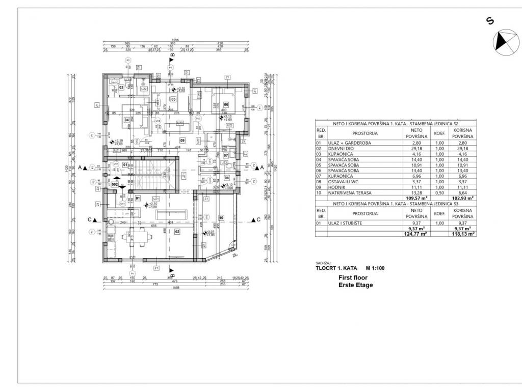 New building for sale, apartment on the first floor. The apartment consists of an entrance with a wardrobe, 3 bedrooms, kitchen-dining room-living room, 2 bathrooms, 1 toilet/storage room, hallway, covered terrace. The apartment has two parking spaces in the courtyard of the building.