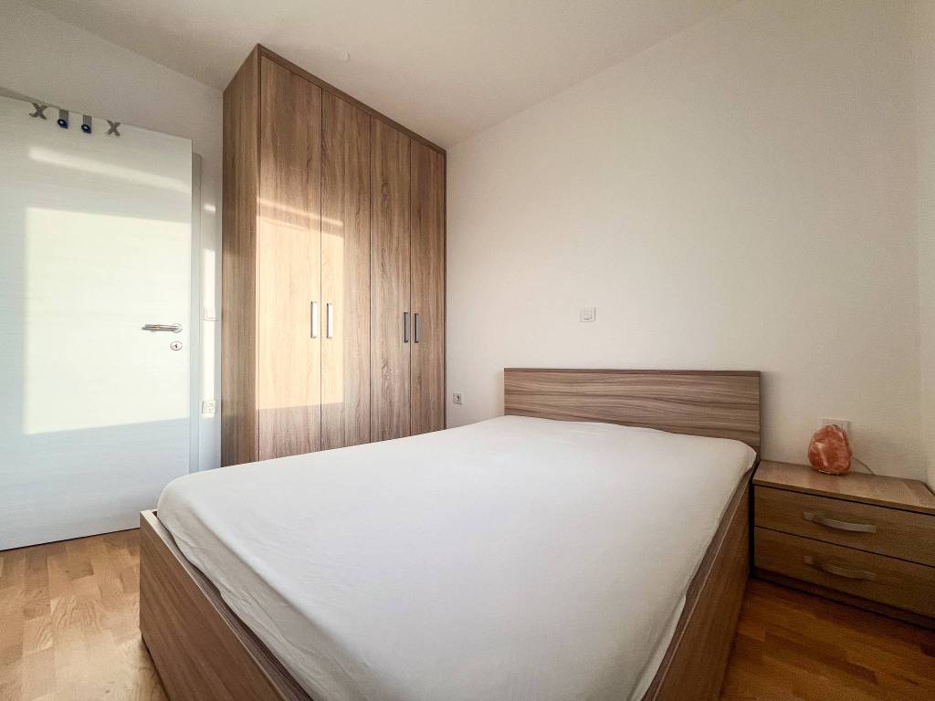 Potpuno je novo namješten te sadrži svu potrebnu opremu - klima uređaj, perilica posuđa, perilica rublja, napa, hladnjak s frižderom, mikrovalna pećnica, 2 + 2 štednjak, pećnica, TV, bračni krevet s boxom, ugradbeni ormari u sobi i hodniku, PVC stolarija, protuprovalna vrata i dr.
