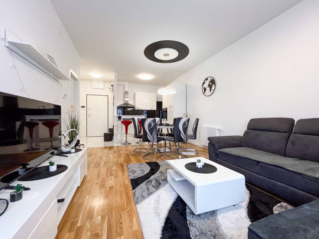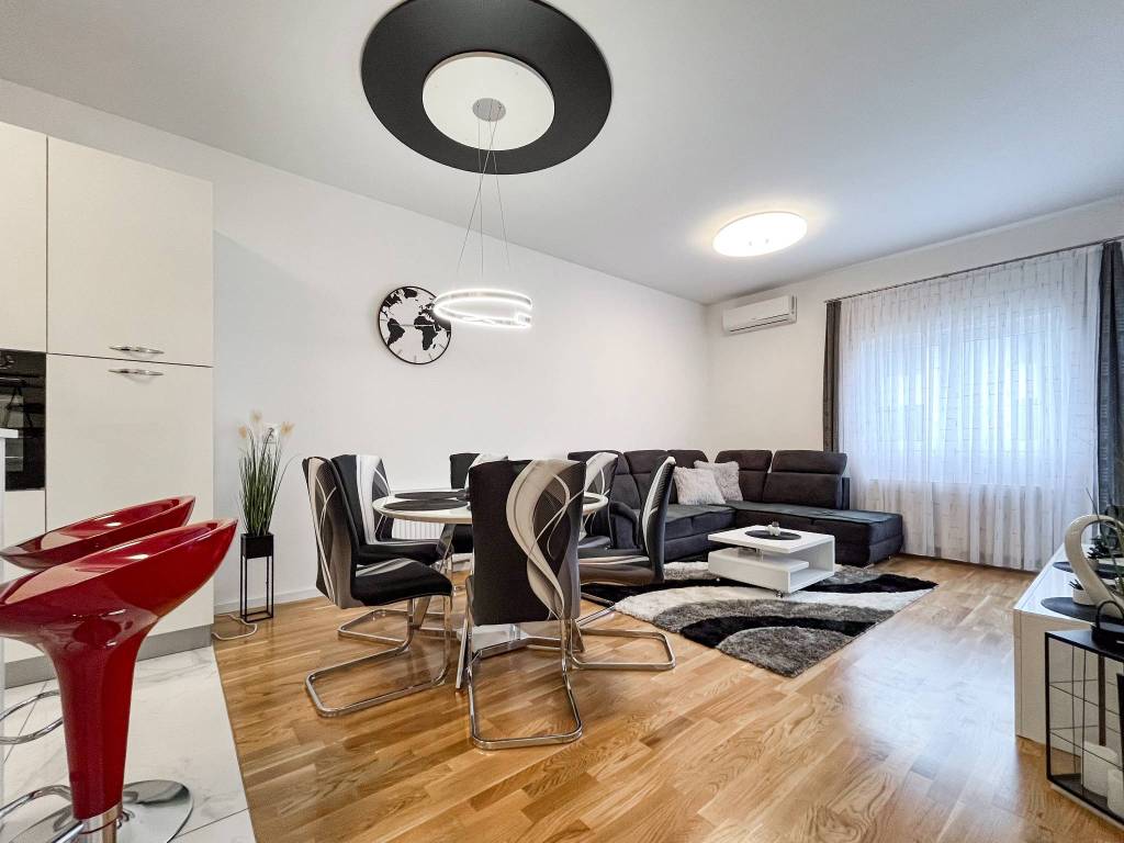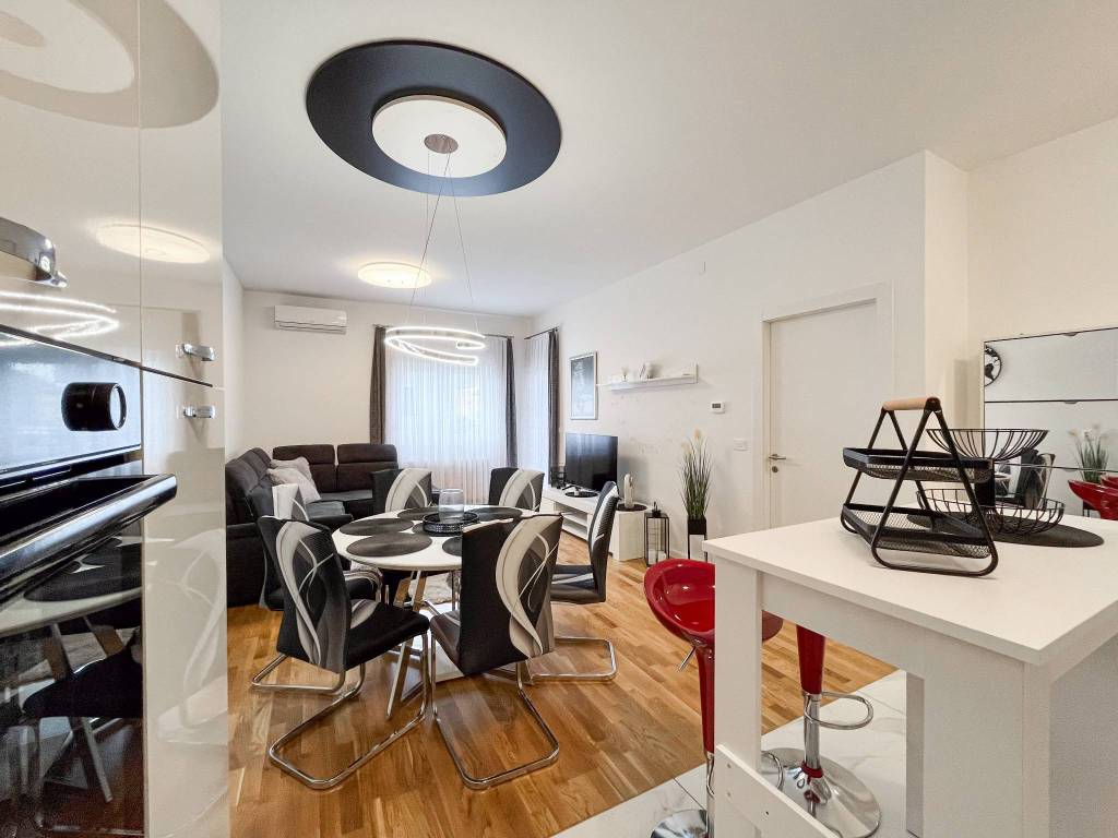 Potpuno je moderno namješten i opremljen svim novim stvarima poput klima uređaja, TVa, interneta, perilice posuđa, perilice rublja, vinskog hladnjaka, kuhinjske ploče, hladnjaka sa zamrzivačem, pećnice, mikrovalne pećnice, kauča na razvlačenje s boxom, bračnog kreveta 160 cm s boxom, ugradbenih ormara, protuprovalnih vrata, video portafona i sl.