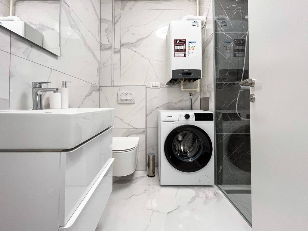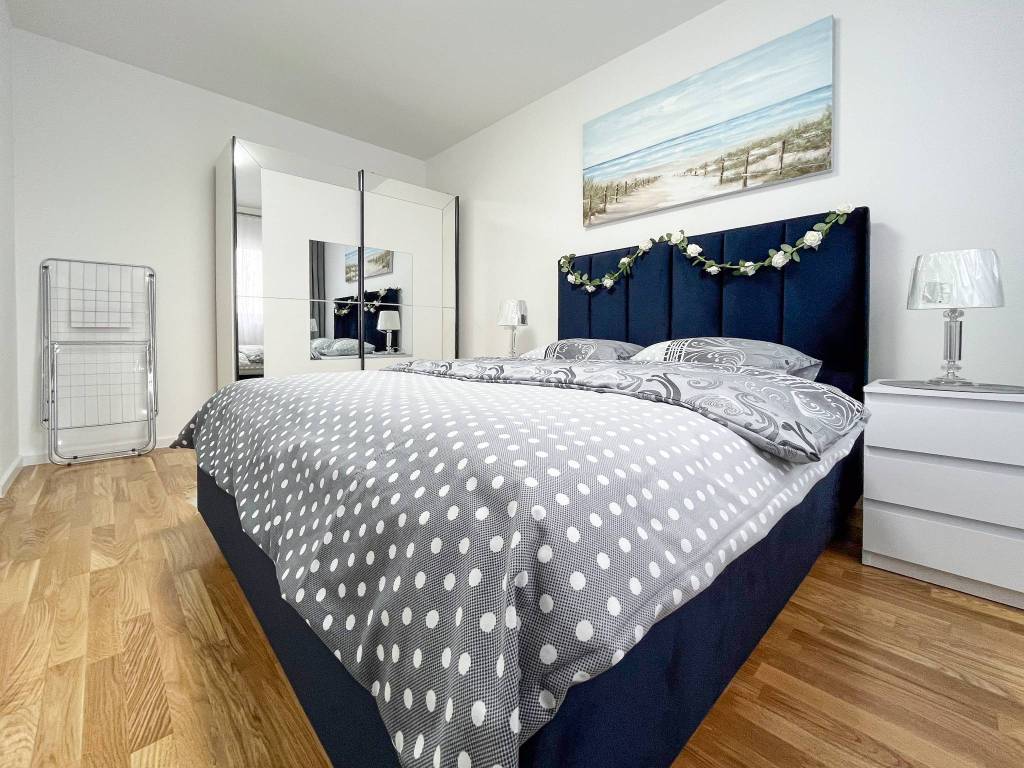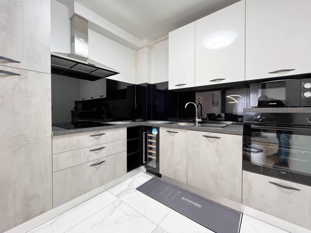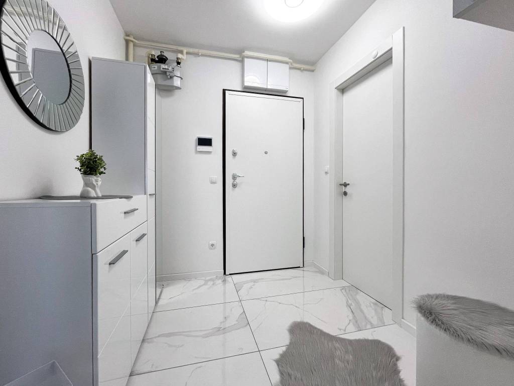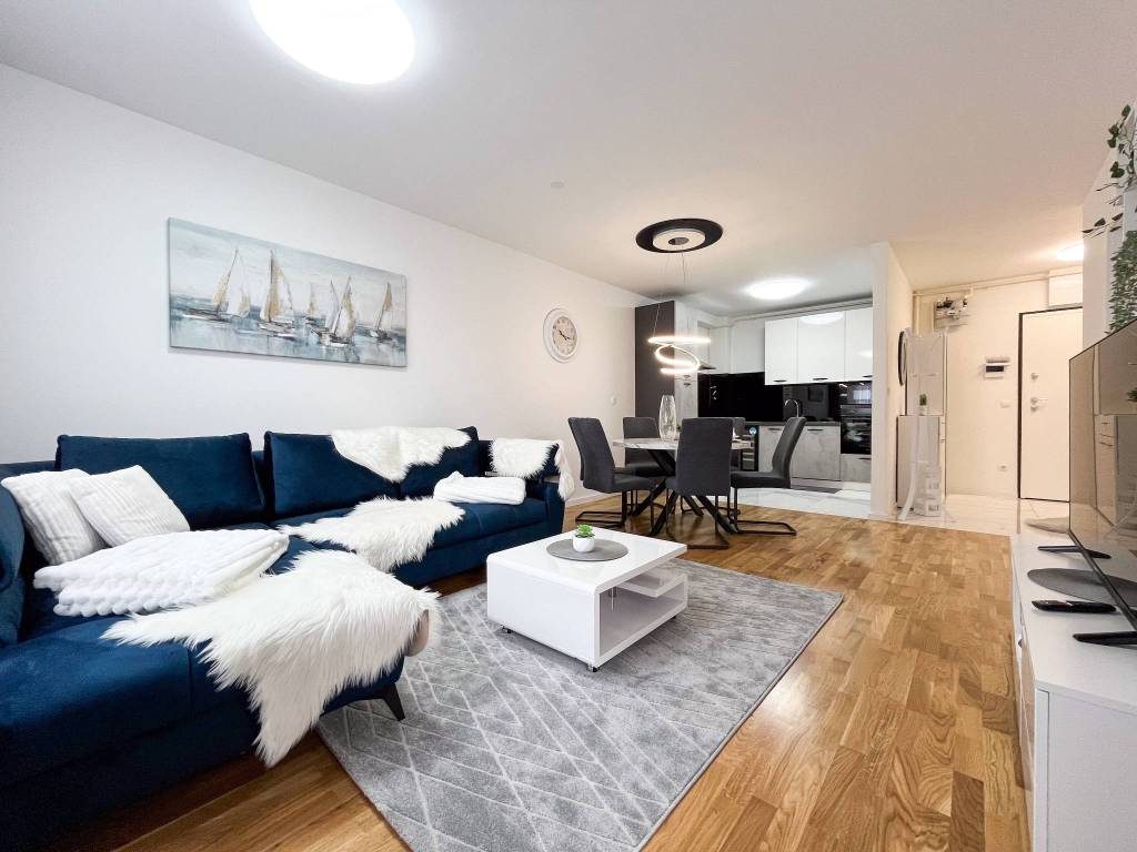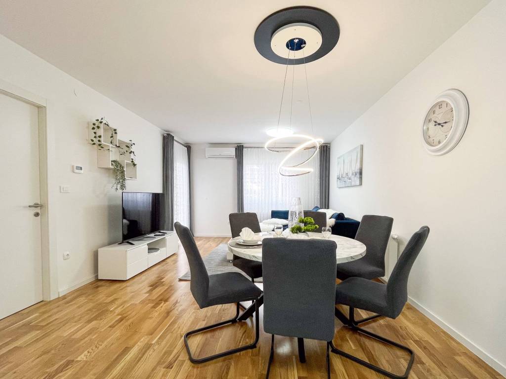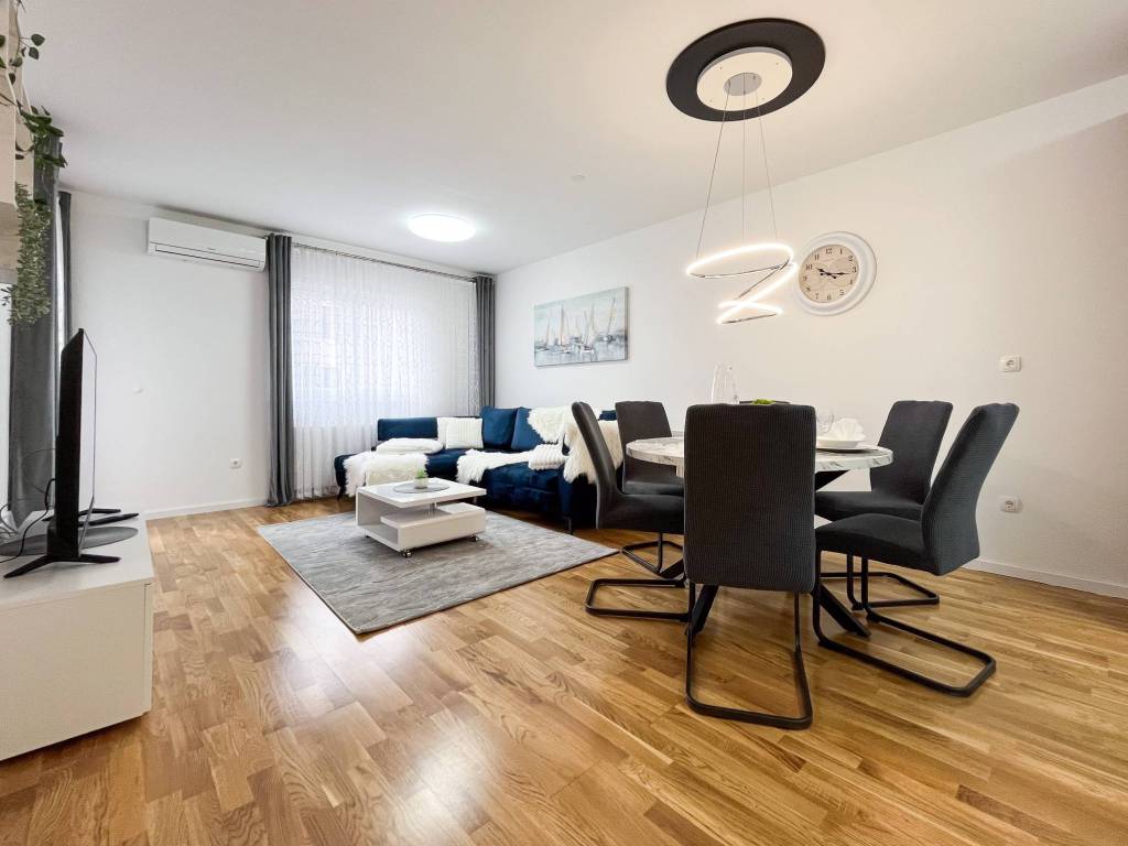 Potpuno je moderno namješten i opremljen svim novim stvarima poput klima uređaja, TVa, interneta, perilice posuđa, perilice rublja, kuhinjske ploče, hladnjaka sa zamrzivačem, pećnice, mikrovalne pećnice, kauča na razvlačenje s boxom, bračnog kreveta 160 cm s boxom, ugradbenih ormara, protuprovalnih vrata, video portafona i sl.