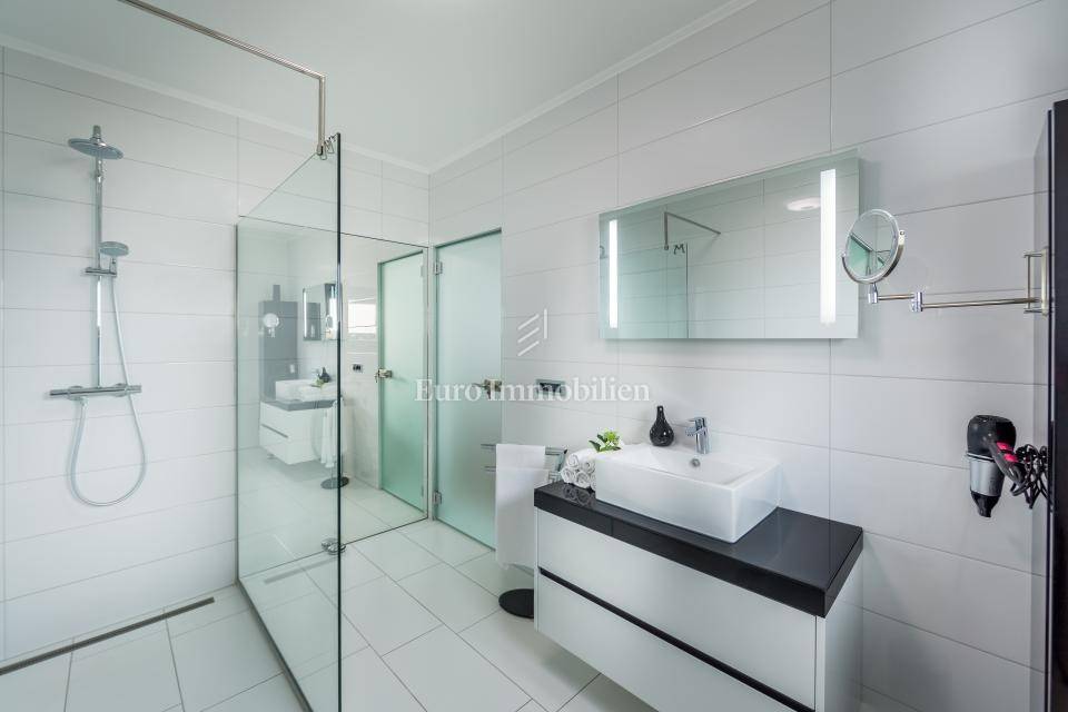 The penthouse consists of a spacious open-concept living room with kitchen and dining room, two bedrooms, one of which contains a private jacuzzi. Furthermore, the apartment consists of a large bathroom with walk-in shower, an additional guest toilet, a small terrace (access from the bedroom) and a large terrace with electronic sun protection and a beautiful sea view.