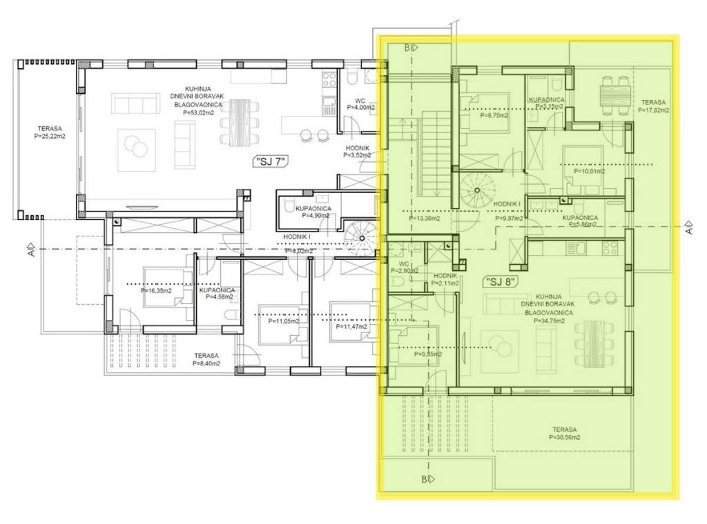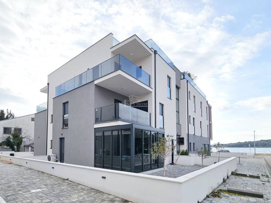 VODICE-SRIMA - penthouse entièrement meublé et équipé à vendre avec terrasse sur le toit, surface habitable de 94,12 m2 + terrasse de 143,12 m2 et parking de 12,50 m2, surface nette totale de 145,49 m2