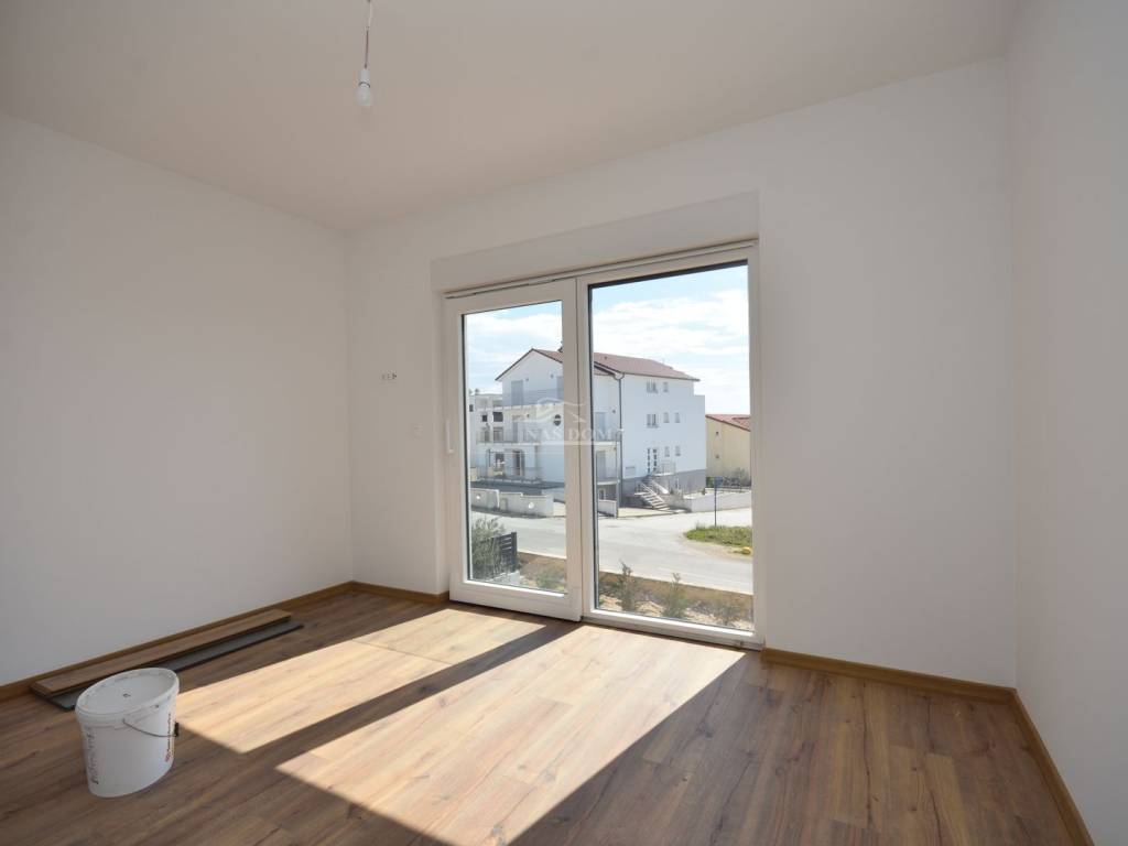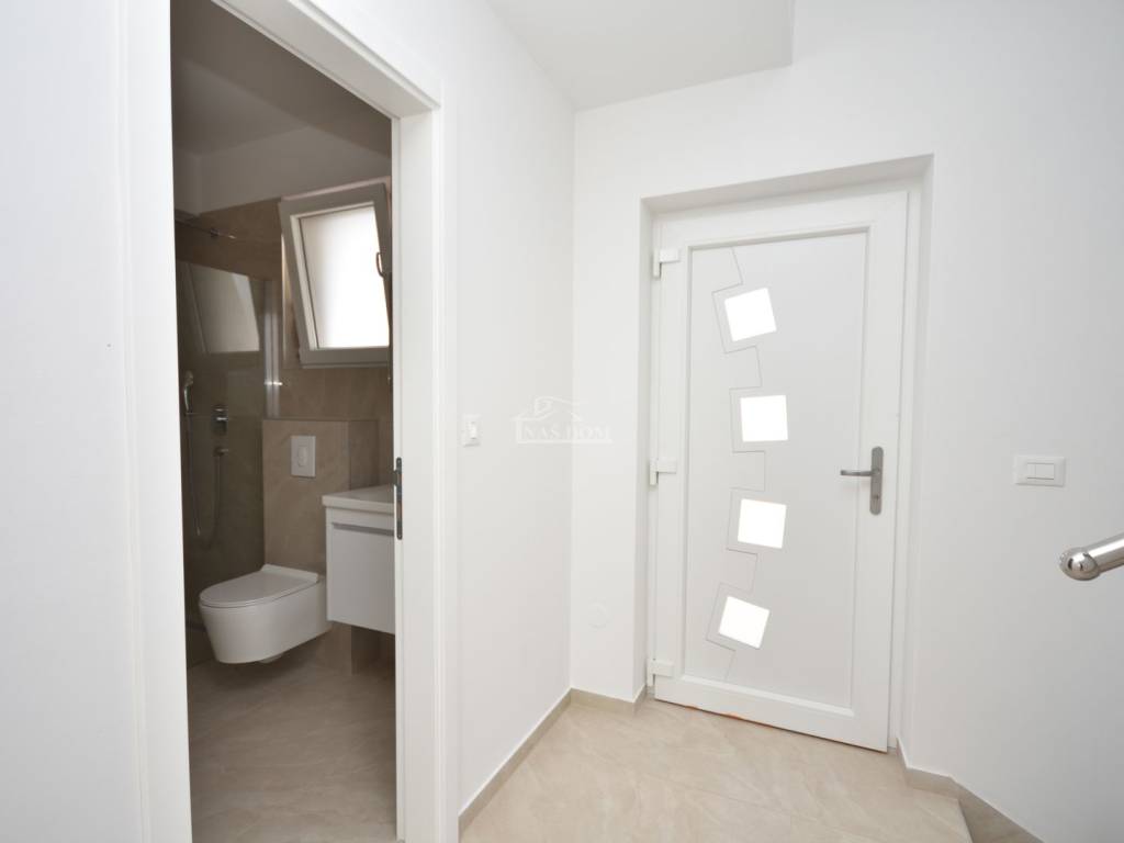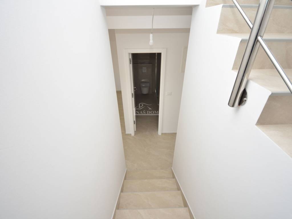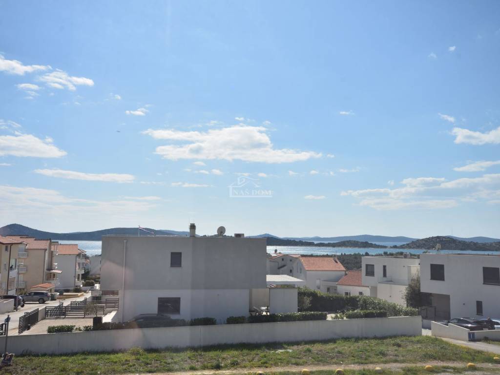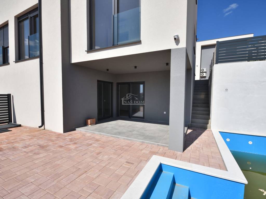 Située dans un emplacement attractif à Vodice, une maison jumelée moderne S2 de qualité supérieure est en vente, avec piscine, jardin spacieux et vue dégagée sur la mer et la ville.