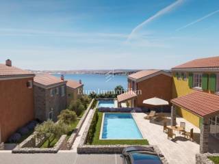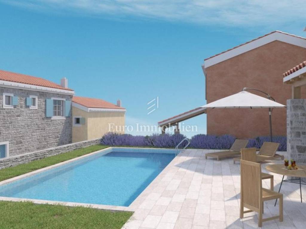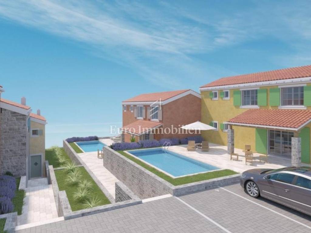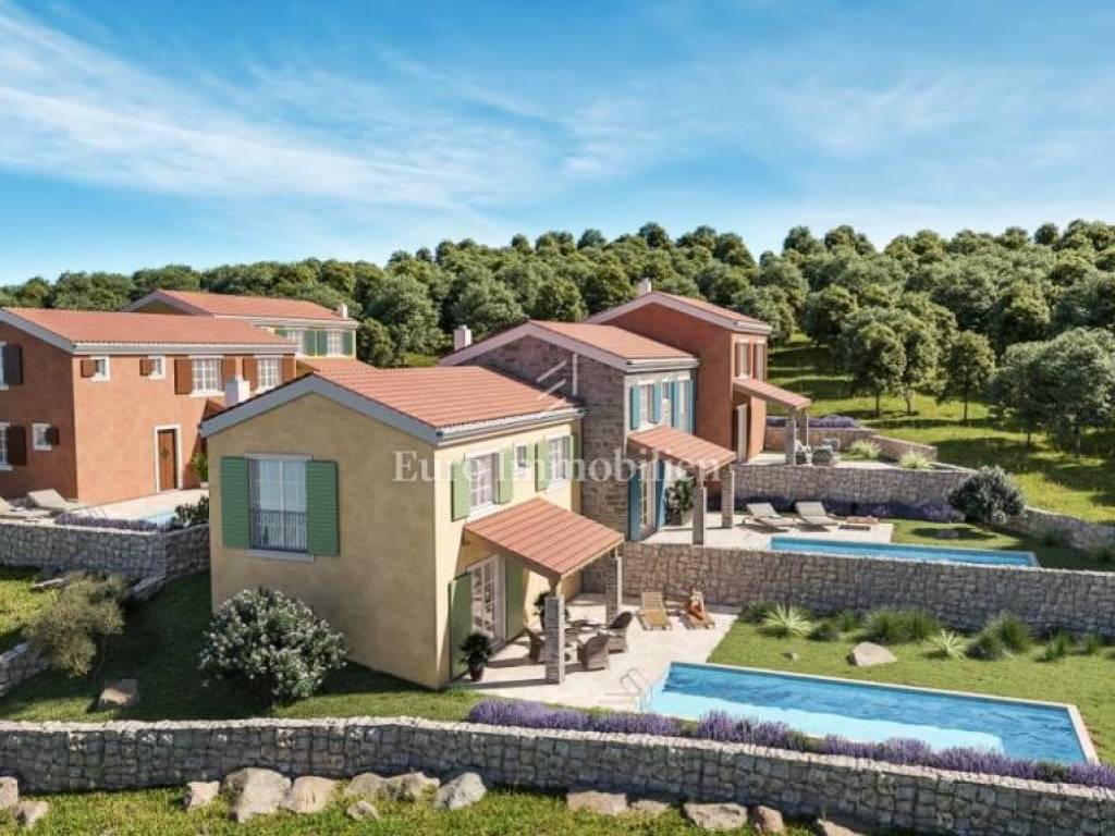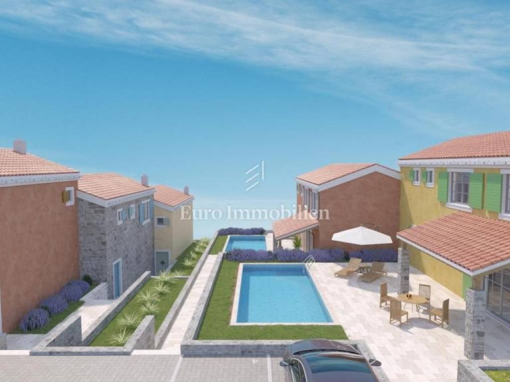 In the dominant location of Crikvenica, next to the green belt, single-family houses in Mediterranean style are for sale. Building plots for 5 buildings, each with a garden and a swimming pool, have been created on the larger plot. Houses are two-storey apartments in nature, where the living room with kitchen and dining room are located on the first floor and everything is integrated into the outdoor area. Upstairs there are three bedrooms and two bathrooms. The expected completion date and occupation is the end of 2025. The possibility of choosing materials for floor and wall coverings and, in the case of this house, the construction of a swimming pool.