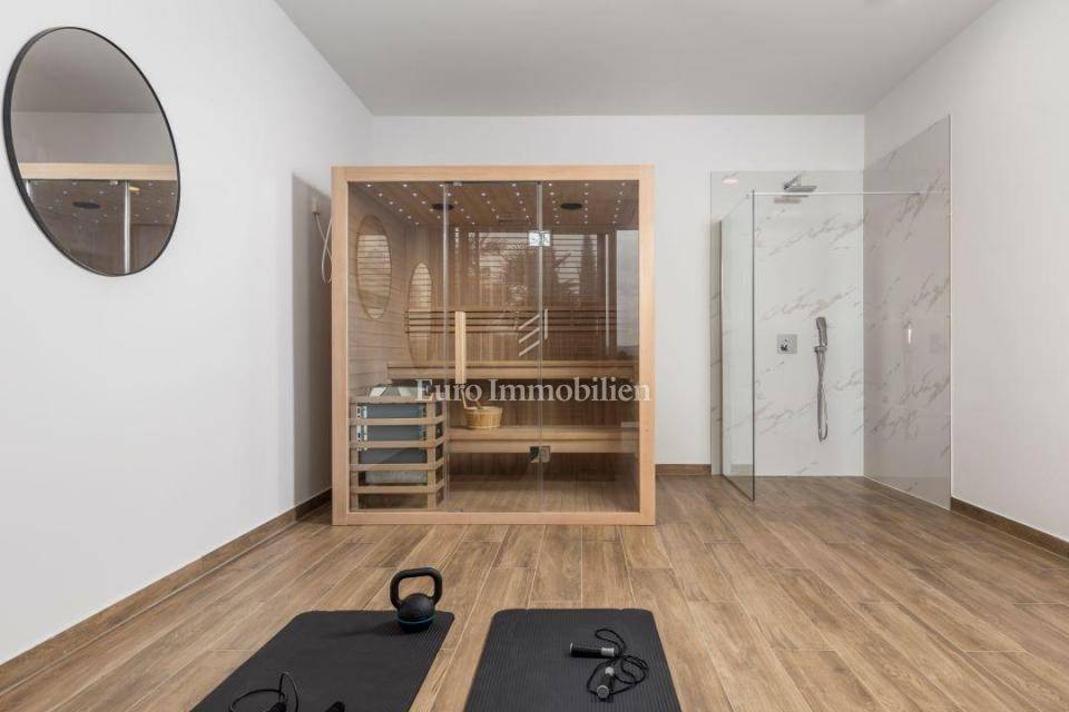 INTERIOR is equipped with trendy furniture, kitchen with complete appliances (white goods + wine bar), living room with lounge and dinner areas, indoor fireplace, rooms with double bed and related furniture, children's rooms with related furniture, master bedroom with its own bathroom and wardrobe , the house has four bathrooms equipped with equipment from renowned manufacturers, a wellness oasis with a Finnish and Turkish bath and an indoor or outdoor hydromassage pool. The spacious terraces are surrounded by a tinted glass fence and parts of wooden vertical pergolas and outdoor ceilings with modern garden furniture.