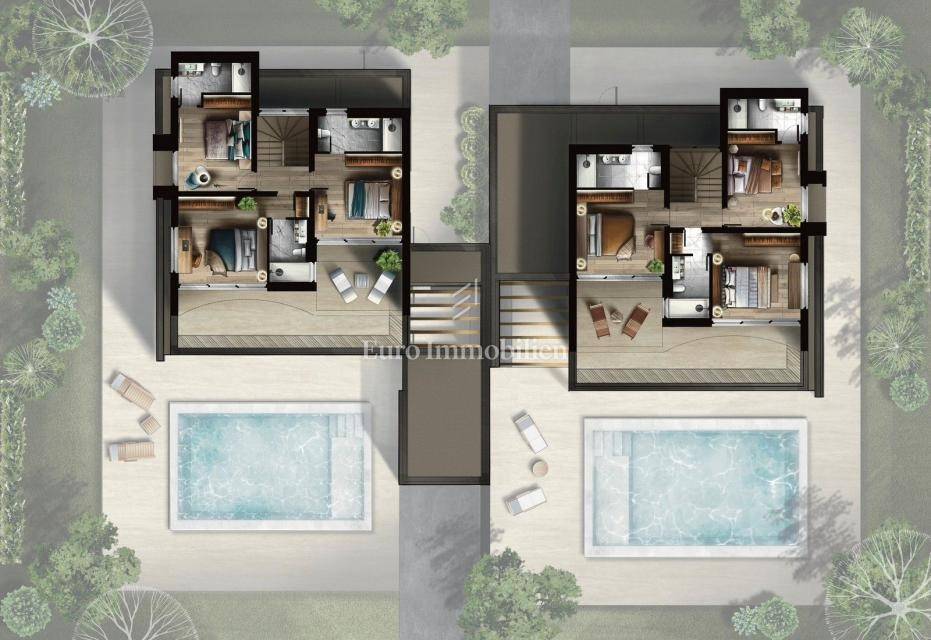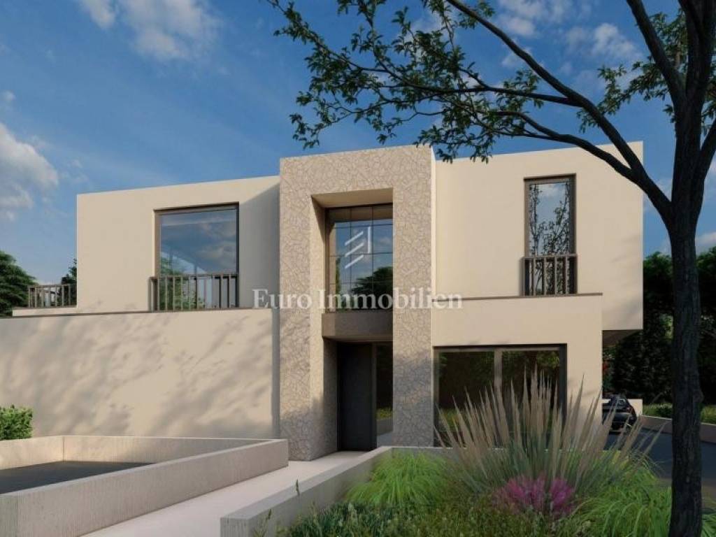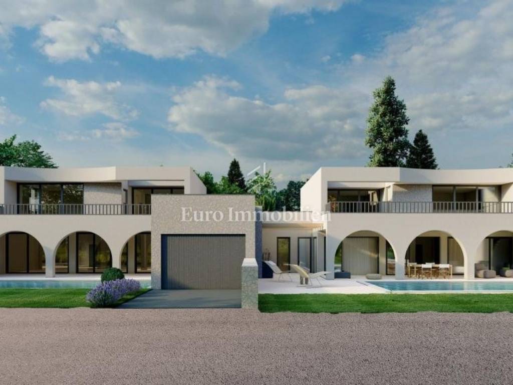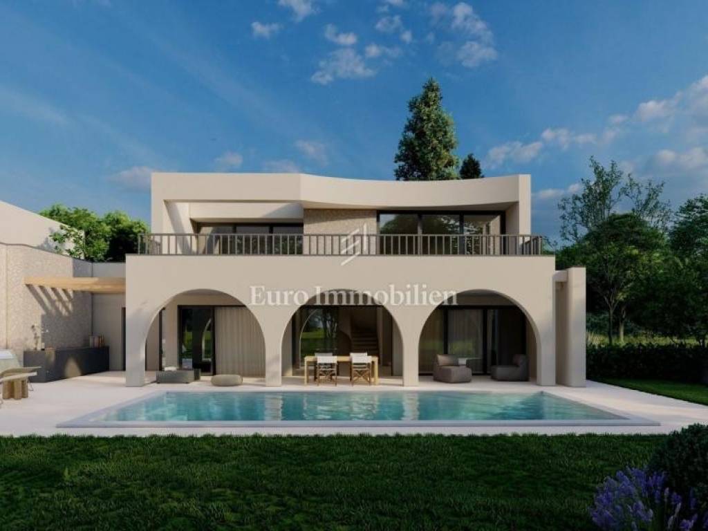 The investor is planning to build this beautiful house, in a quiet location in the small Istrian town of Kaštelir. The house is located with a swimming pool on a plot of 617 m2. It consists of a ground floor and an upper floor, with a total area of ​​203.55 m2. The ground floor has an entrance hall, living room, kitchen, dining room, bedroom and bathroom. The living room, which is oriented to the south and west, leads to a spacious covered terrace with a summer kitchen of 31.92 m2, and a landscaped garden with a swimming pool. On the first floor there are three more bedrooms, each with its own bathroom, and a large covered terrace of 40.42 m2. The heating is underfloor via a heat pump, and air conditioning with a heating and cooling system will also be installed. The joinery is high-quality aluminum. Two parking spaces for cars are provided, and the villa has a garage for one vehicle.