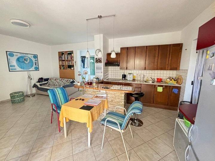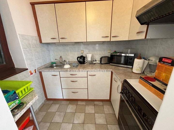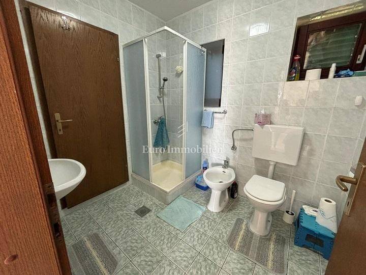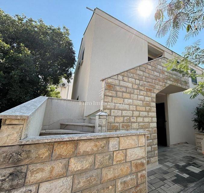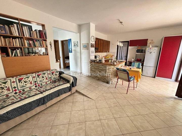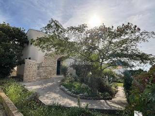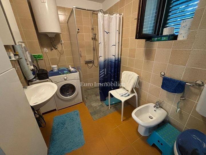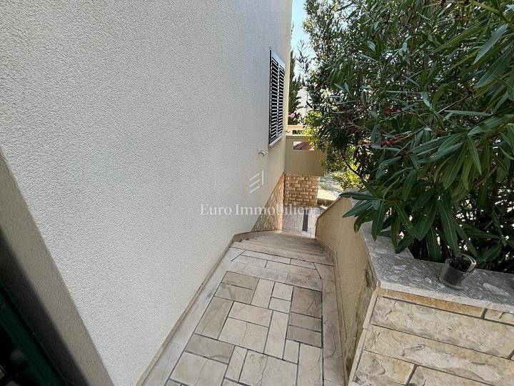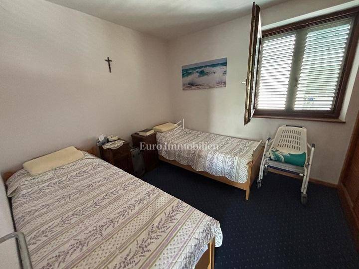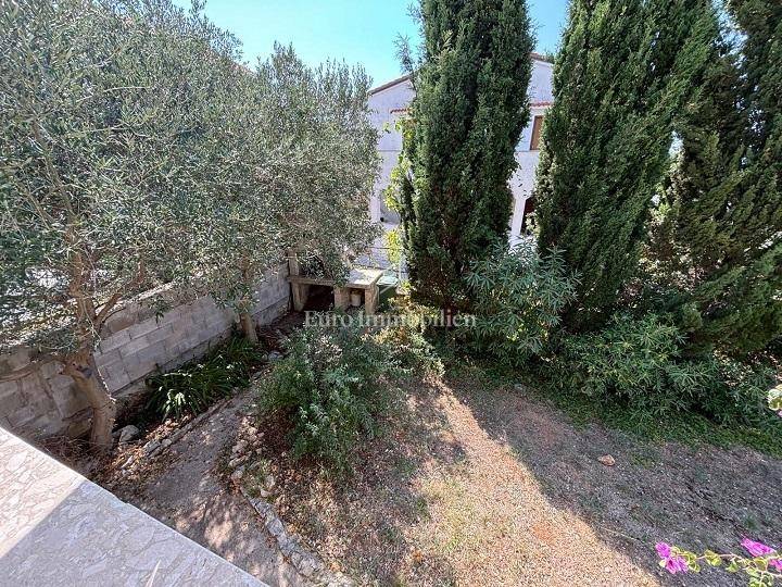 Ground floor: garage and two storage rooms. First floor: apartment with a living room, kitchen, bathroom, bedroom and large terrace. Second floor: apartment with a living room, kitchen, bathroom, bedroom and large terrace with a sea view. The yard of 370 m² includes Mediterranean greenery and a stone barbecue. The beach is about a 10-minute walk away.
