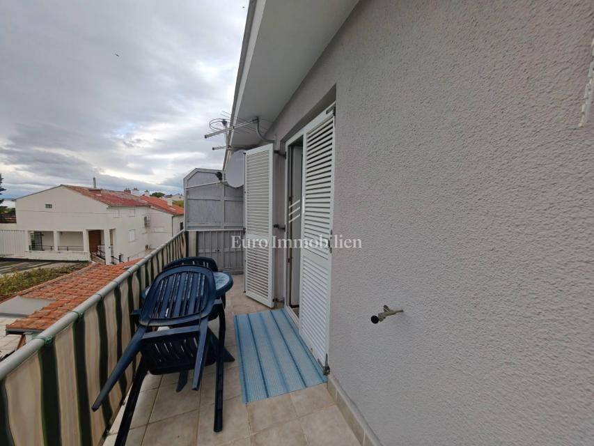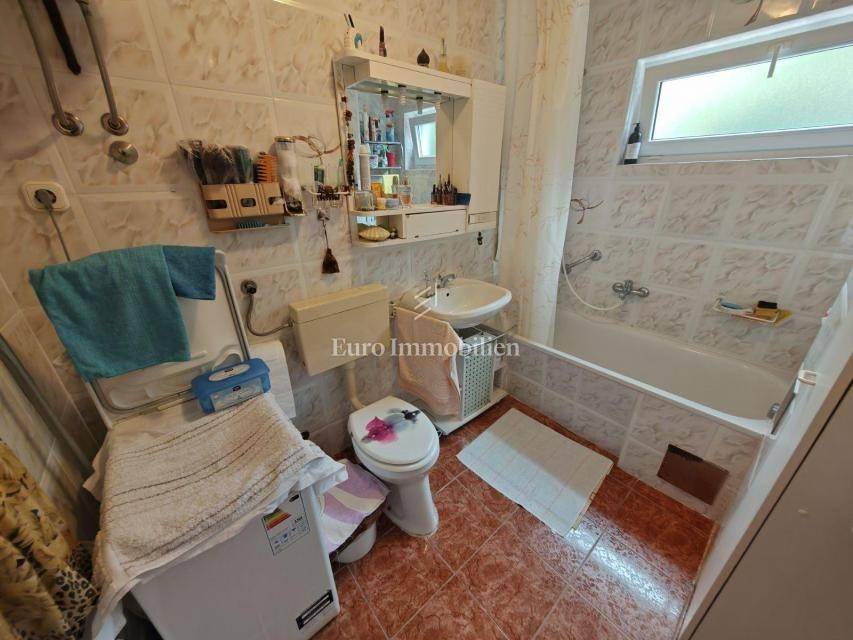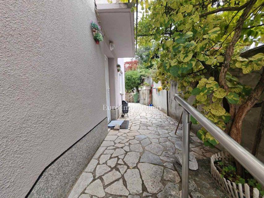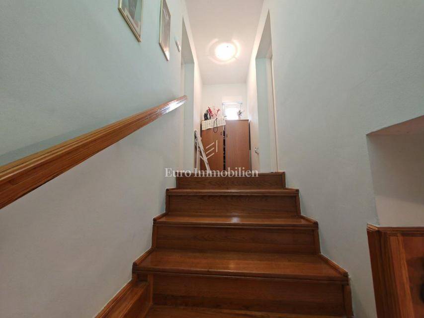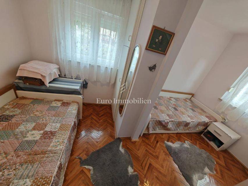 For sale is a semi-detached house near the city center with a total area of 100 m2 and a beautifully landscaped garden of 260 m2. On the ground floor there is an entrance hall, a kitchen, a bathroom and a spacious living room from which internal stairs lead to the first floor. Upstairs is a bedroom with a balcony overlooking the sea and another smaller bedroom. The building has a separate entrance, on the garden is a storage room and a fenced yard that is connected to the front and back of the house and provides privacy for summer gatherings.