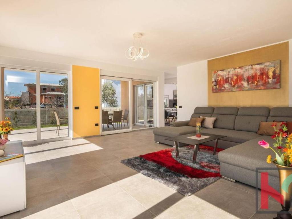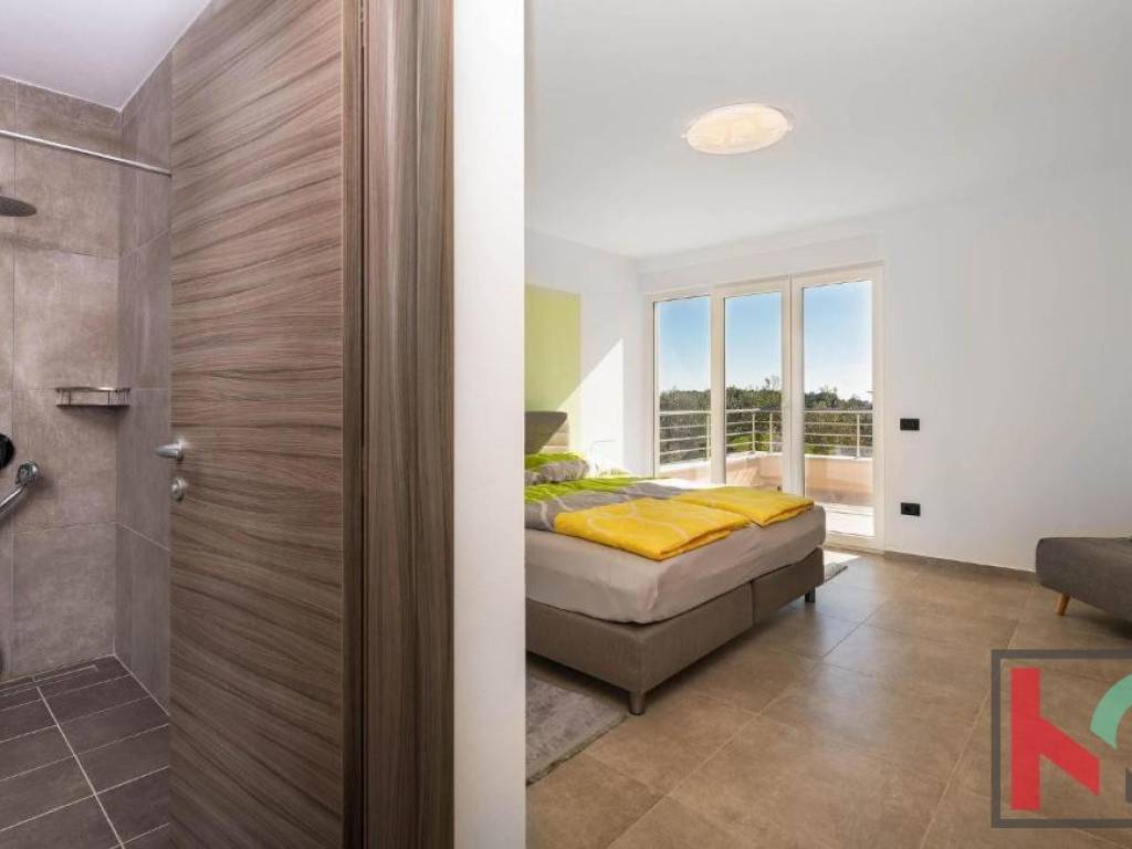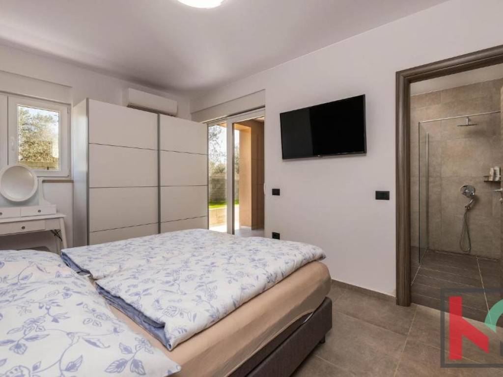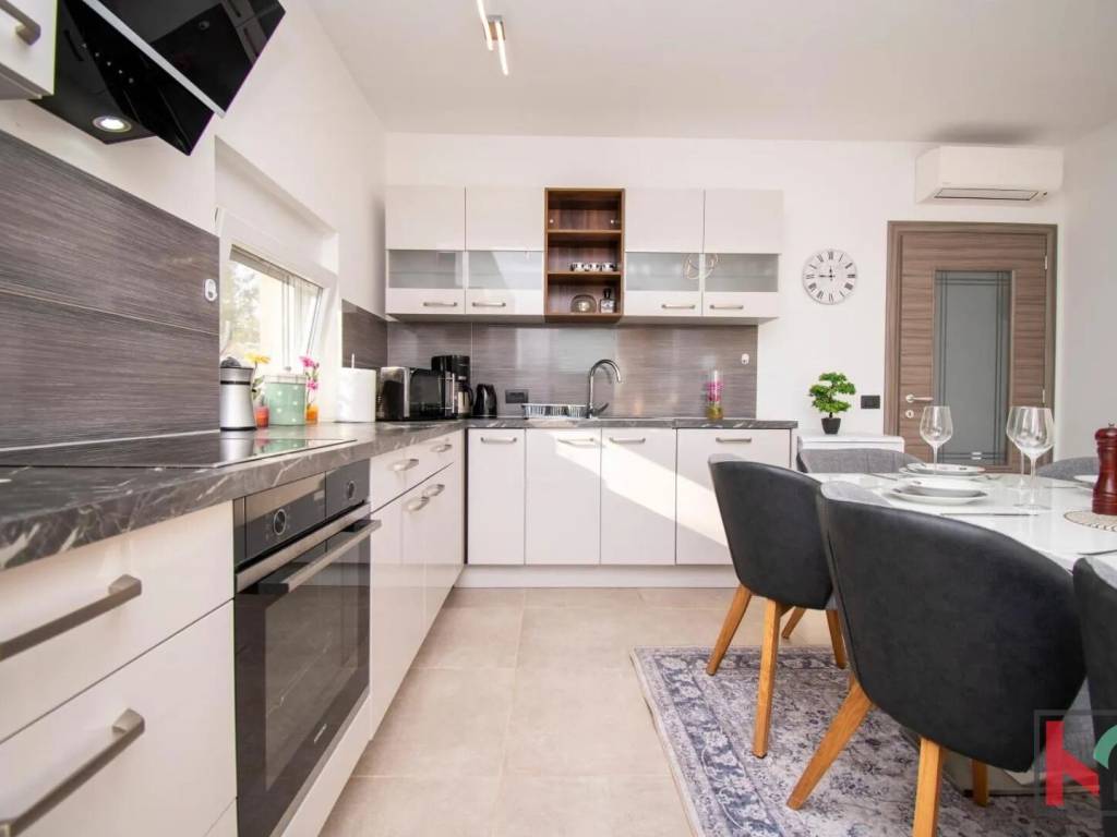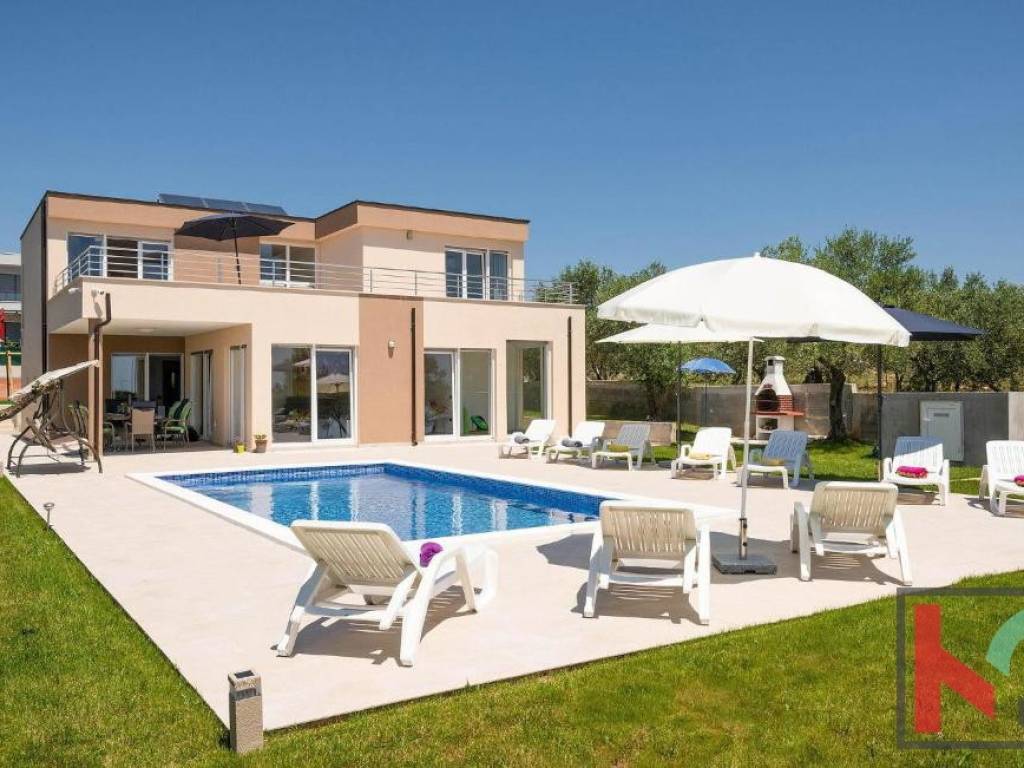 In a quiet part of Vodnjan, located on a dead-end street, this modern villa is situated on a plot of 1,171 m2, with an open view of the Istrian landscape, the sea, and the Brijuni archipelago.