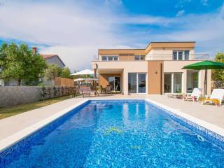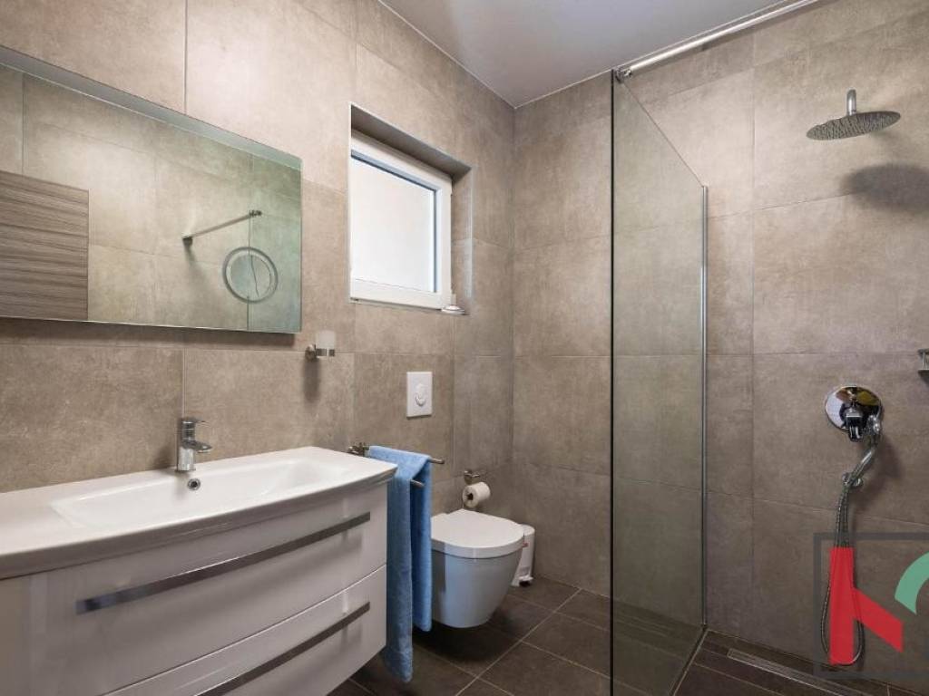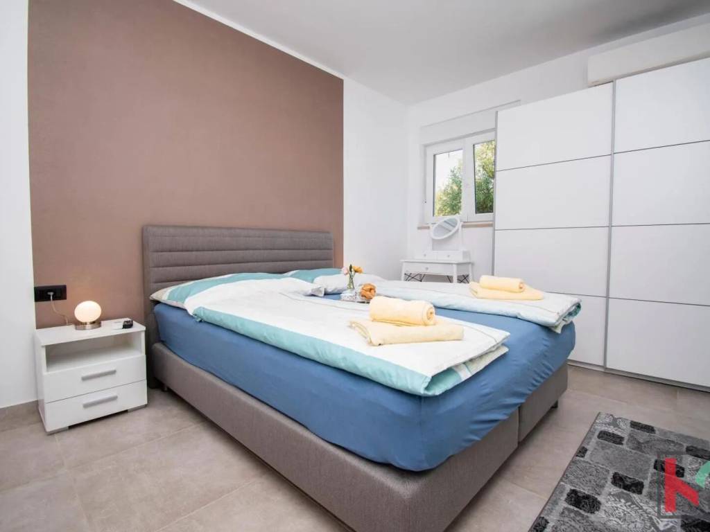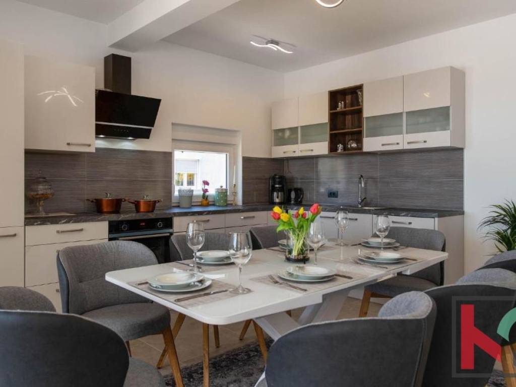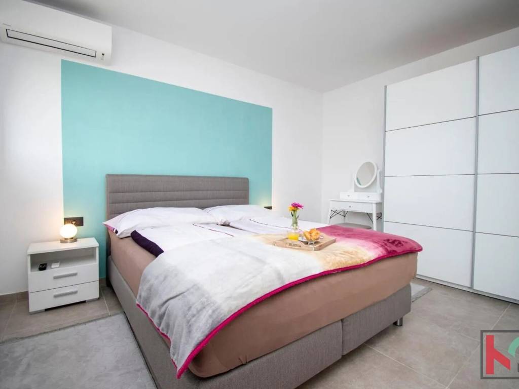 In a quiet part of Vodnjan, located on a dead-end street, this modern villa is situated on a plot of 1,171 m2, with an open view of the Istrian landscape, the sea, and the Brijuni archipelago.