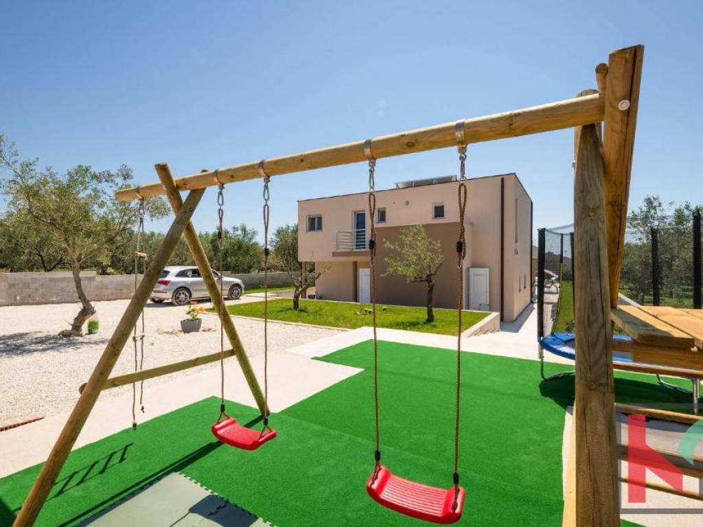 The landscaped and fenced yard includes a 28 m2 swimming pool, sunbathing area, barbecue zone, children's playground, and a Mediterranean garden with olive trees.