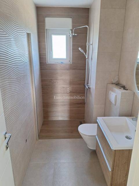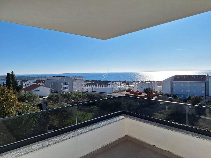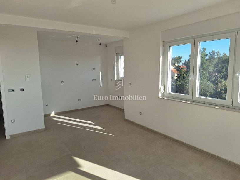 Novalja - apartment of 75.25 m2 on the second floor of a new building, about 10 minutes walk to the beach It consists of an entrance hall, bathroom, toilet, 2 bedrooms, storage room and a living room with kitchen and dining room from which you can exit to a terrace with a panoramic view of the sea. The apartment is equipped with top-quality sanitary ware and bathroom furniture. 2 parking spaces are provided.