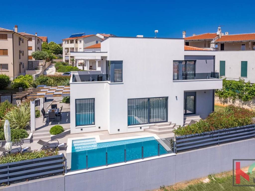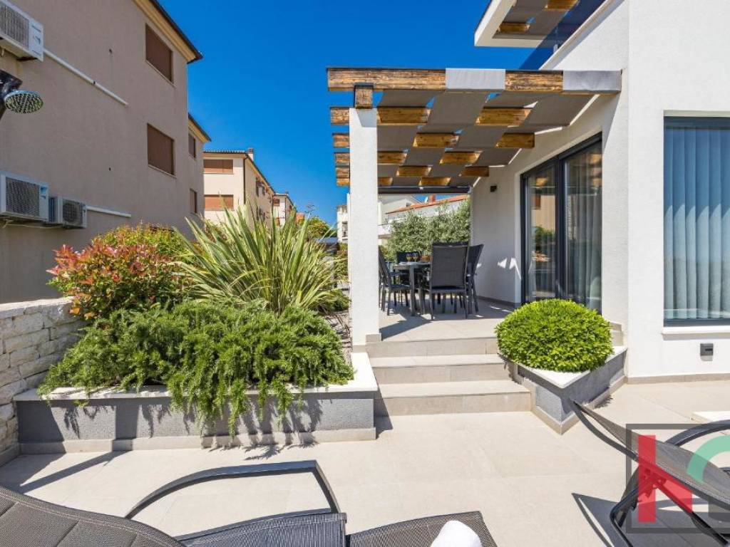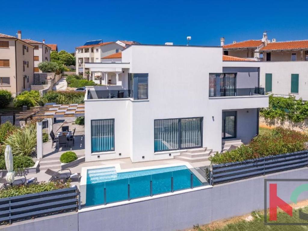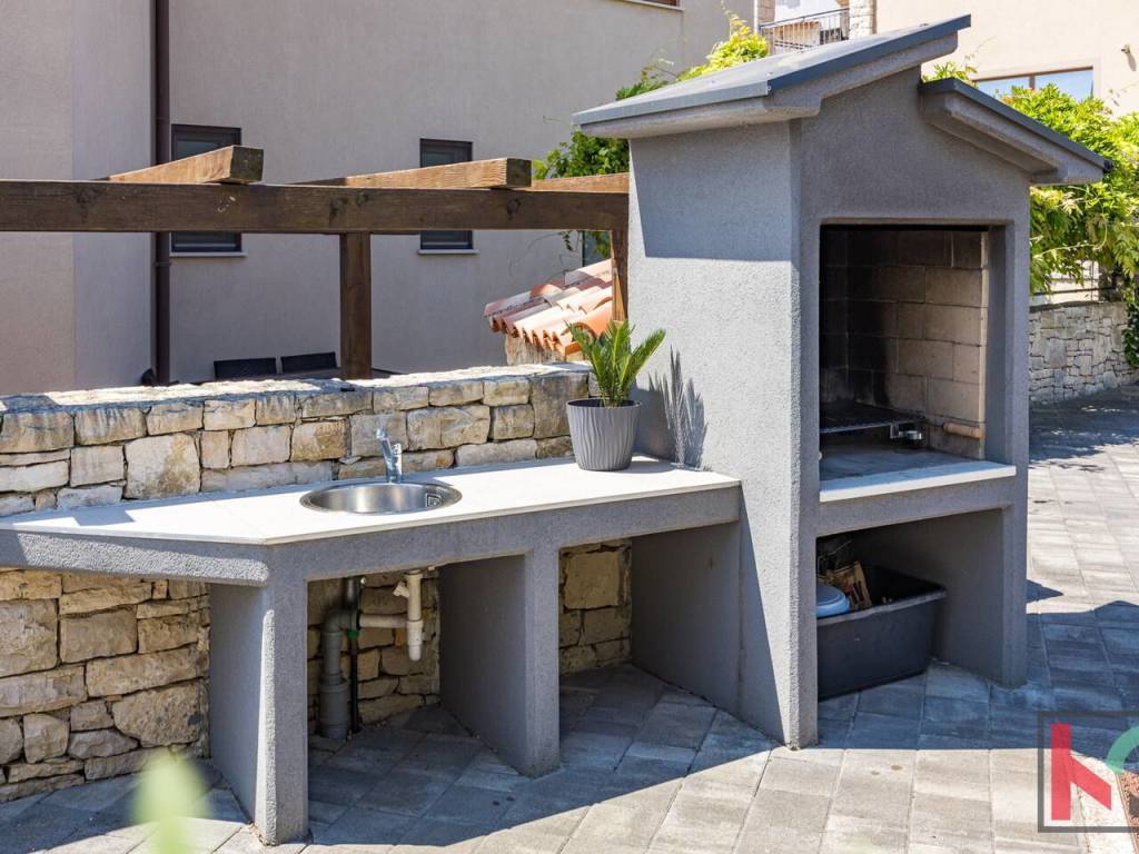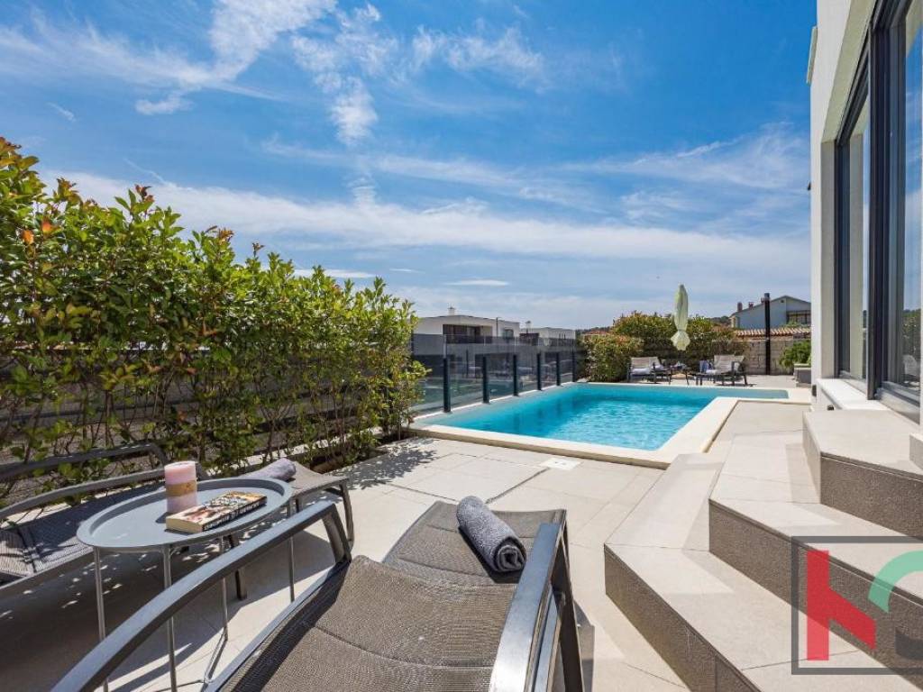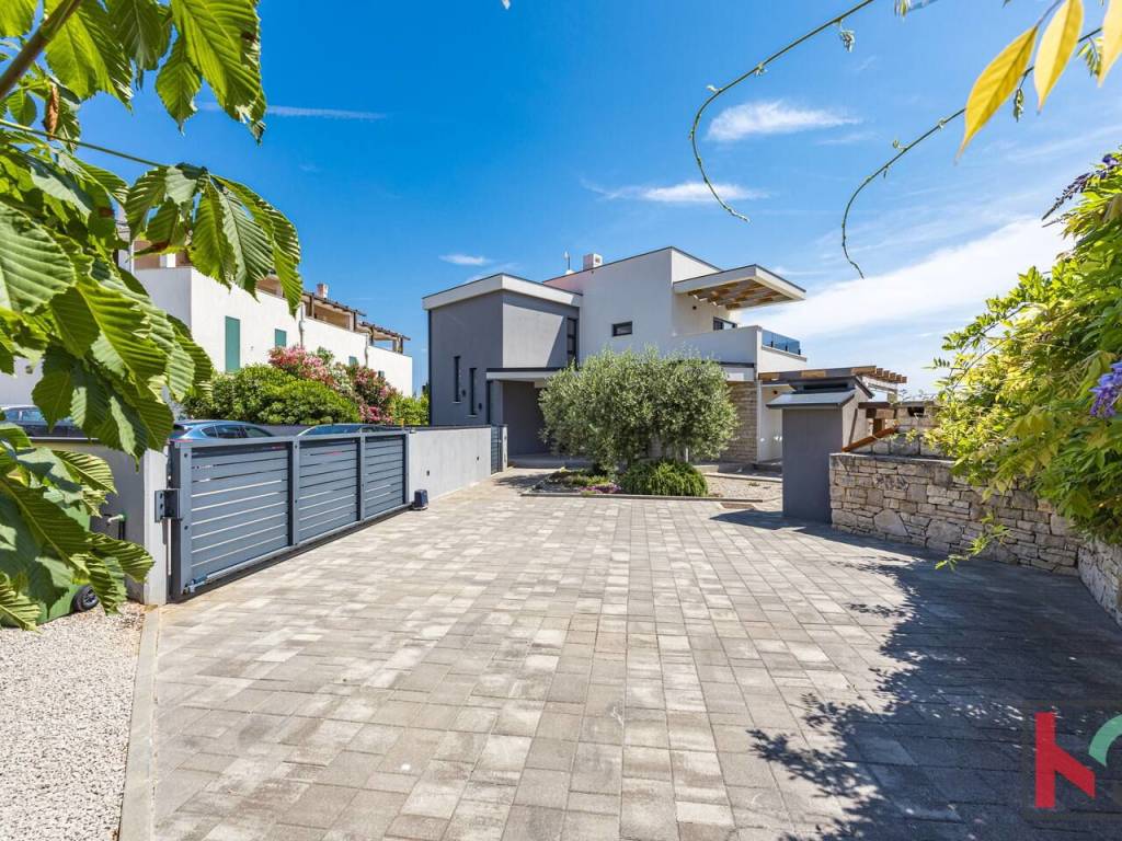 Okućnica vile uređena je u mediteranskom stilu te nudi potpuni mir i uživanje na otvorenom zraku, bazen površine 25 m2 sa sunčalištem, natkrivenom terasom, roštilj, kao i dva parkirna mjesta.