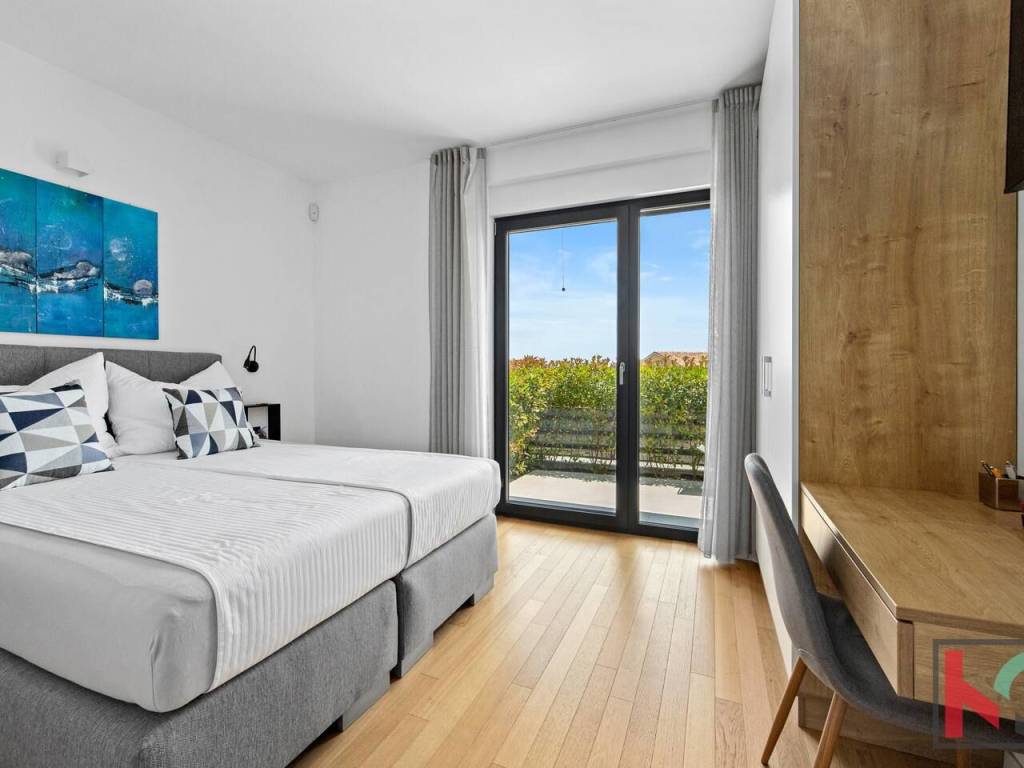 Prizemlje vile sastoji se od ulaznog hodnika, open space prostora sa dnevnim boravkom, kuhinjom i blagovaonom te velikim staklenim stijenama sa izlazom na natkrivenu terasu i bazen. U prizemlju vile također su smješteni gostinjski toalet, jedna spavaća soba s vlastitom kupaonicom i ostava.
