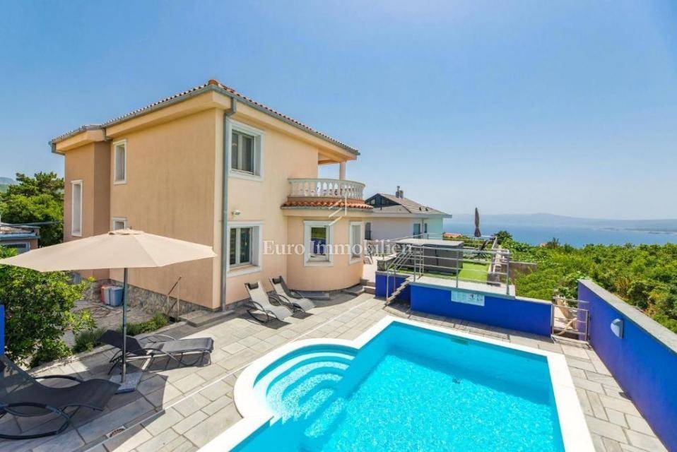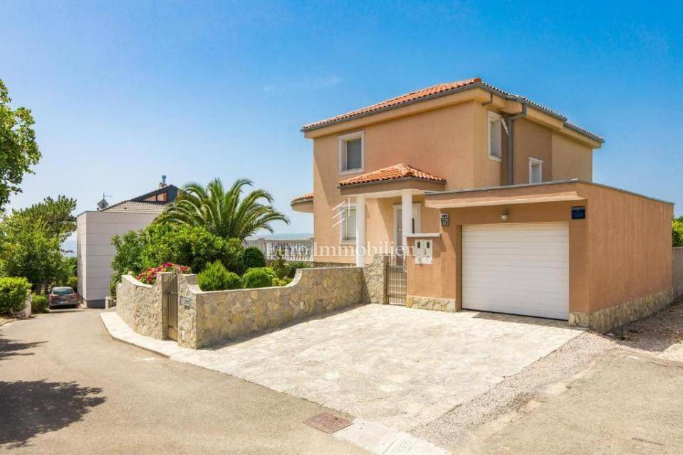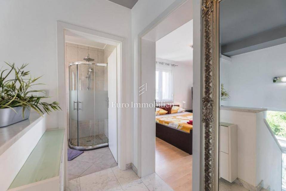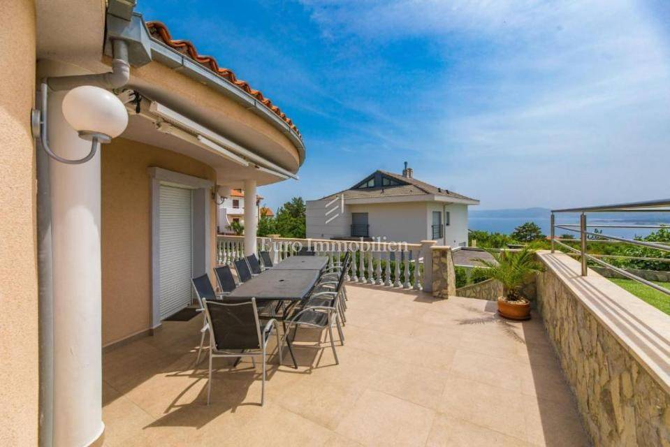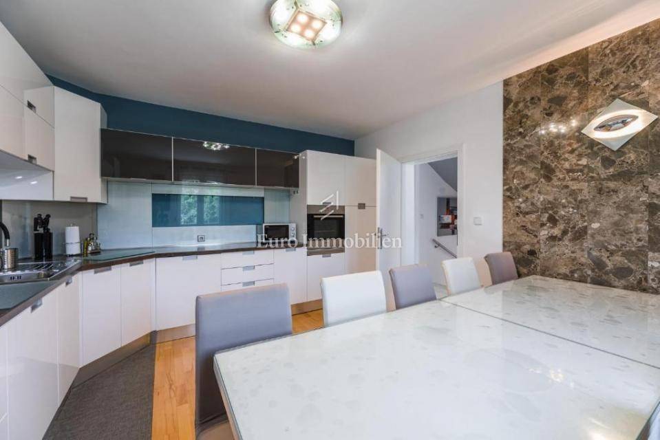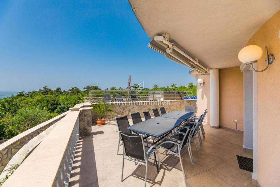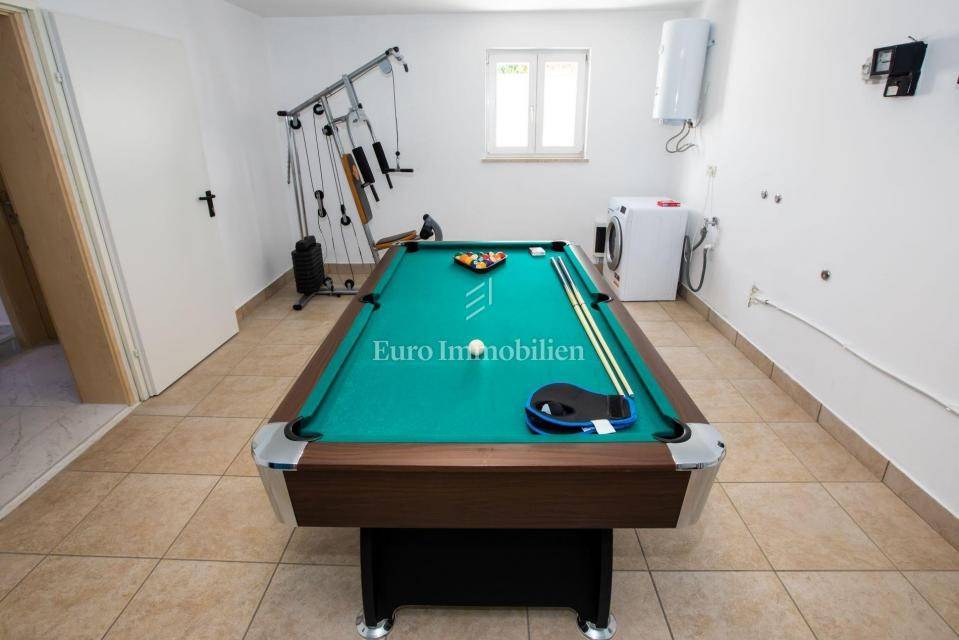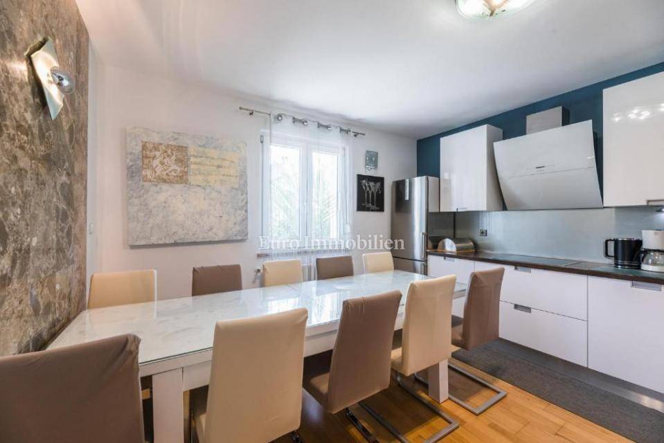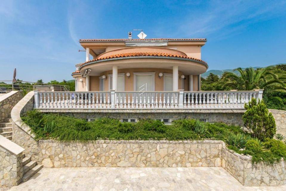 A villa with a swimming pool for sale, located in a quiet part of the town of Crikvenica. It consists of a basement, ground floor and first floor. In the basement there is a large three-room apartment with two bathrooms. Next to the apartment there is also a room for hanging out, a technical room, and two storage rooms. On the ground floor there is a living room with a fireplace, full of light, a kitchen with a dining room, a pantry, a bedroom, a bathroom and a large outdoor terrace. An internal staircase leads to the first floor where there are three bedrooms, two bathrooms, one of which is a master bedroom with its own bathroom and dressing room. All rooms open onto a terrace with a beautiful view of the sea. On a beautifully landscaped garden full of greenery, there is a terrace, swimming pool, barbecue, facilities for socializing and enjoying. There are two garages, one of 25 m2 and the other of 35 m2.