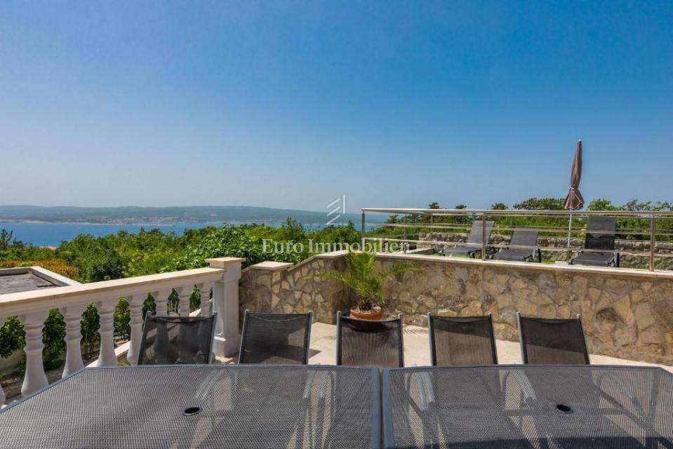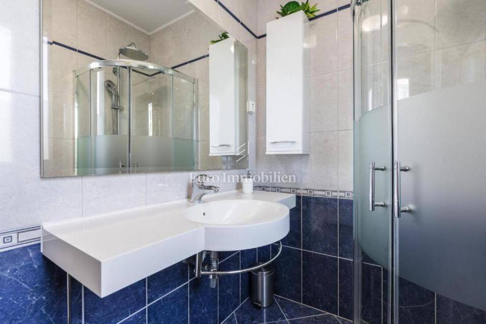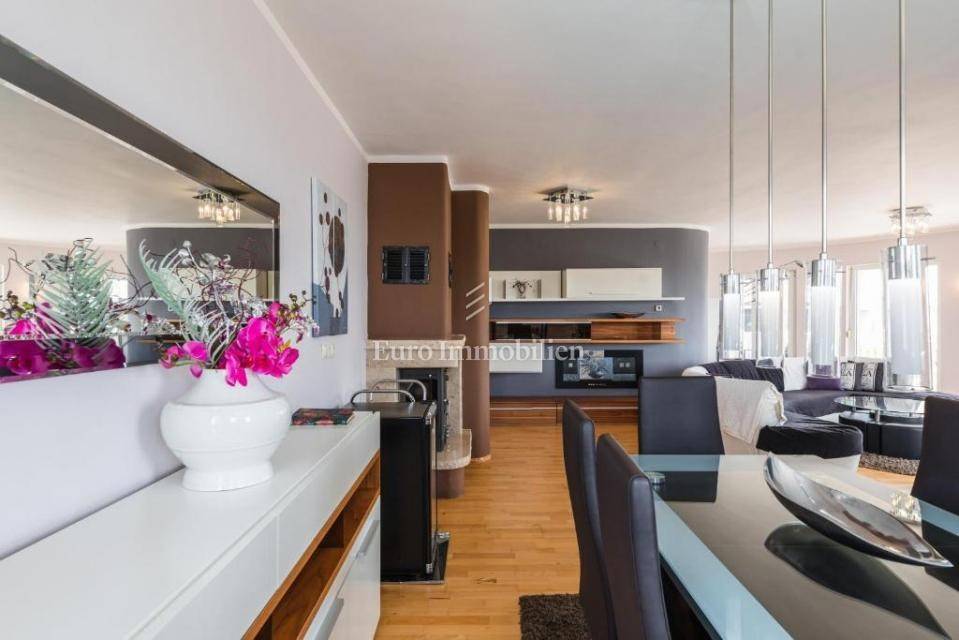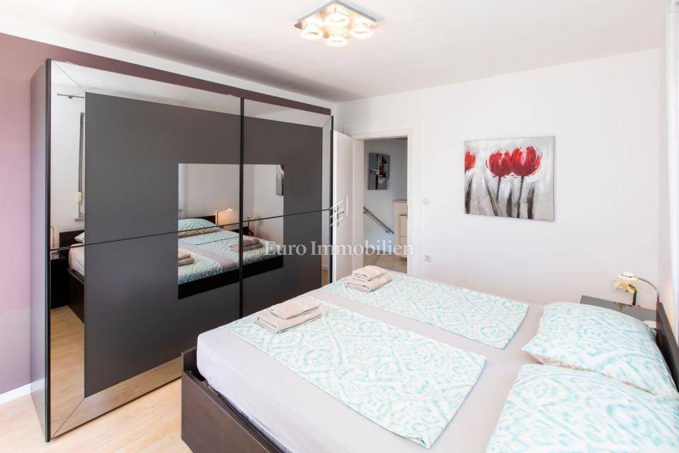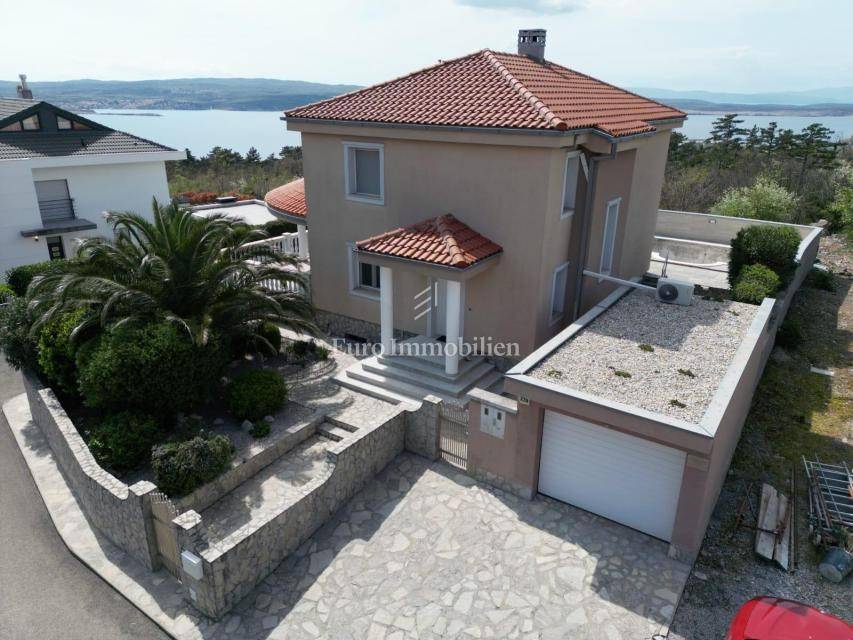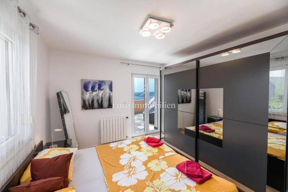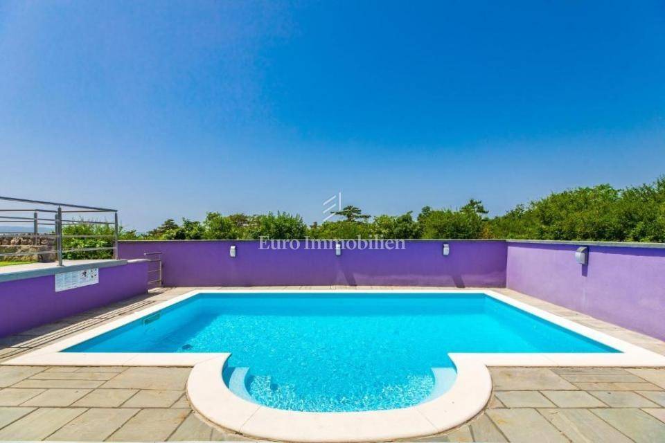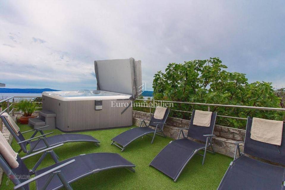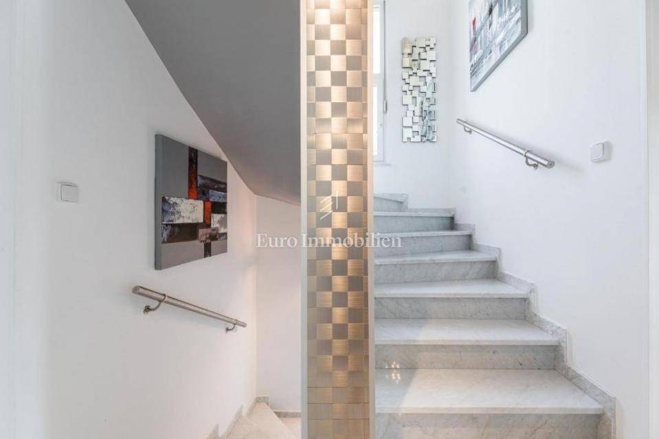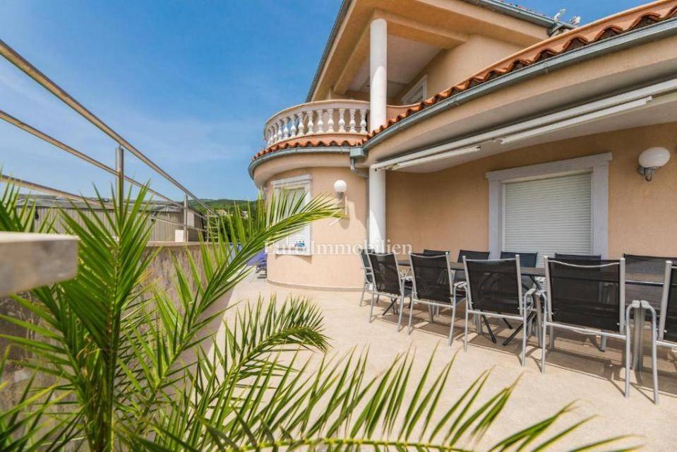 A villa with a swimming pool for sale, located in a quiet part of the town of Crikvenica. It consists of a basement, ground floor and first floor. In the basement there is a large three-room apartment with two bathrooms. Next to the apartment there is also a room for hanging out, a technical room, and two storage rooms. On the ground floor there is a living room with a fireplace, full of light, a kitchen with a dining room, a pantry, a bedroom, a bathroom and a large outdoor terrace. An internal staircase leads to the first floor where there are three bedrooms, two bathrooms, one of which is a master bedroom with its own bathroom and dressing room. All rooms open onto a terrace with a beautiful view of the sea. On a beautifully landscaped garden full of greenery, there is a terrace, swimming pool, barbecue, facilities for socializing and enjoying. There are two garages, one of 25 m2 and the other of 35 m2.