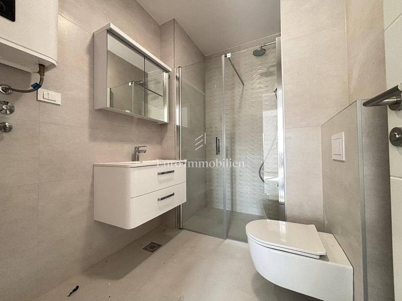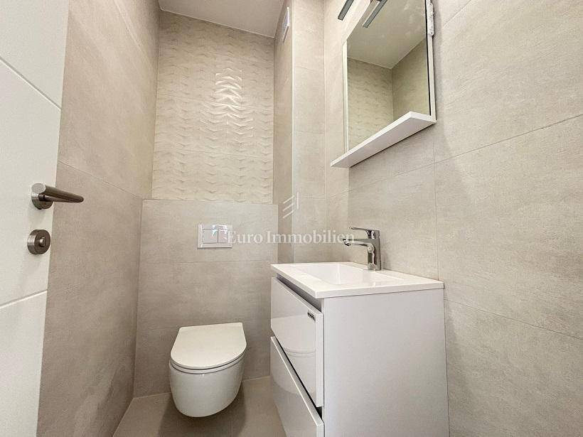It consists of a hallway, bathroom with toilet, additional toilet, two bedrooms, spacious living room with kitchen, balcony and large covered terrace of 17.65 m2. The apartment is equipped with underfloor heating and air conditioning. The apartment also has a parking space. It is only a 10-minute walk to the sea and the city center. Only the highest quality materials and equipment were used in the construction.