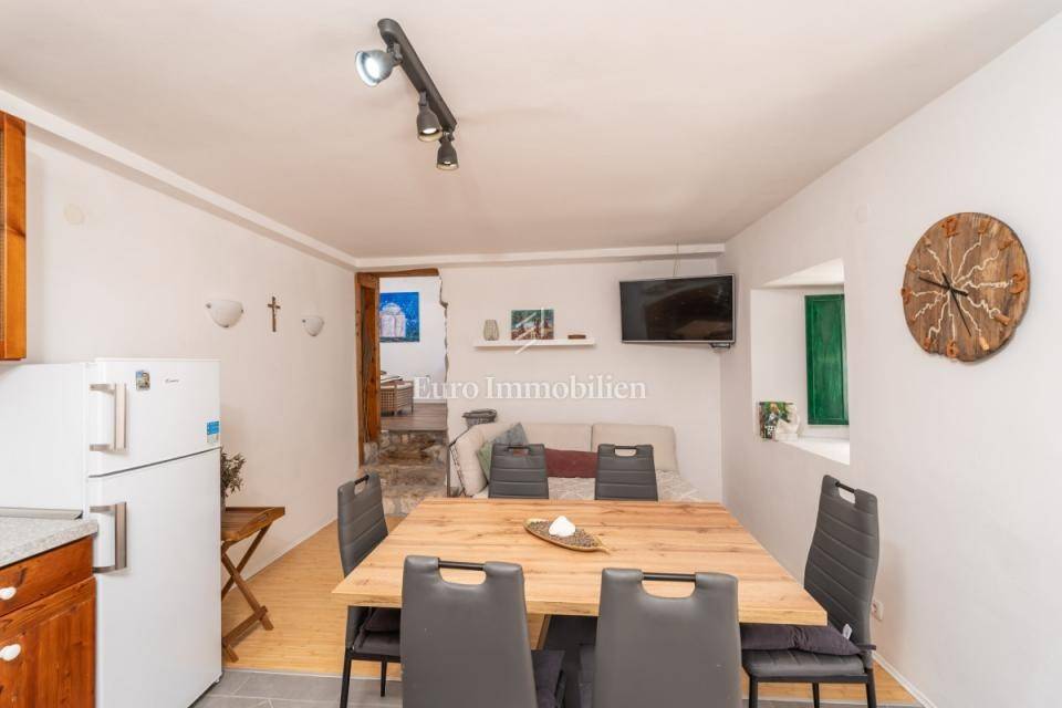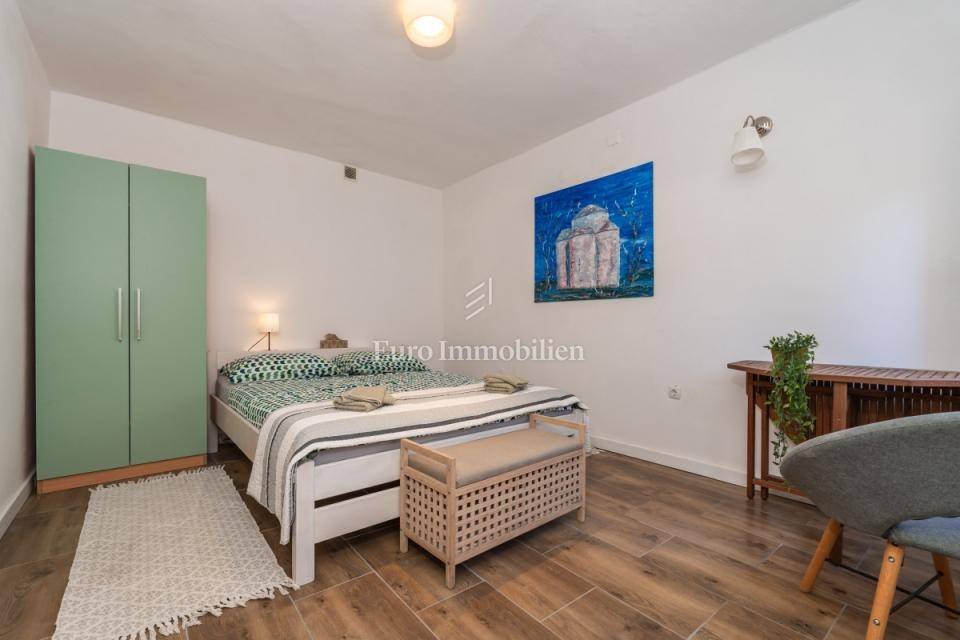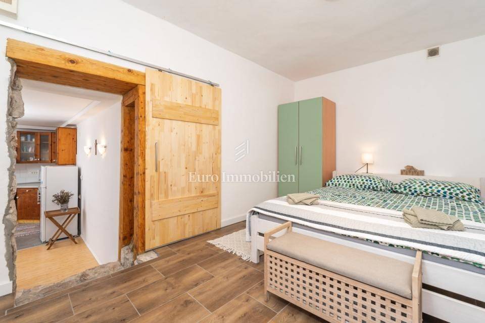 On the ground floor is kitchen with a living room, a bathroom and a spacious bedroom, while on the first floor there are additional rooms that are currently used as a sleeping area. The house is fully equipped, with air conditioning on the ground floor and on the first floor and electric heating.