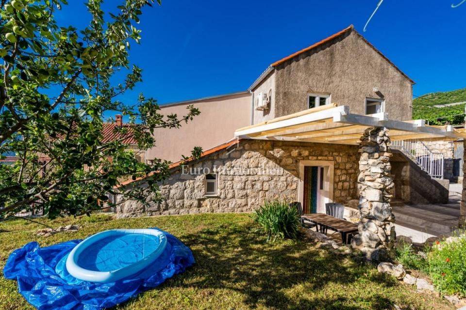 The property is located in an elevated position and consists of a main house, two auxiliary buildings, a plot with a total area of 900 m², of which 700 m² is landscaped garden, along with a designated parking area.