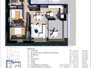 The apartment has area of 83.72 m² and consists of an open-plan kitchen, dining area and living room, a hallway, a separate guest toilet, a bathroom, two bedrooms, and covered and uncovered terrace.