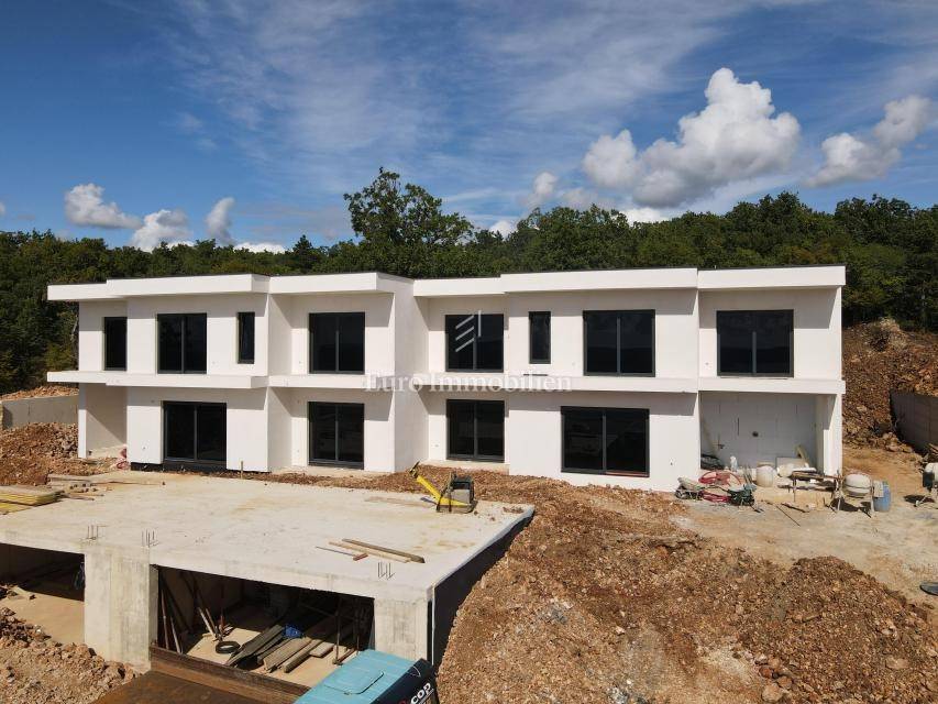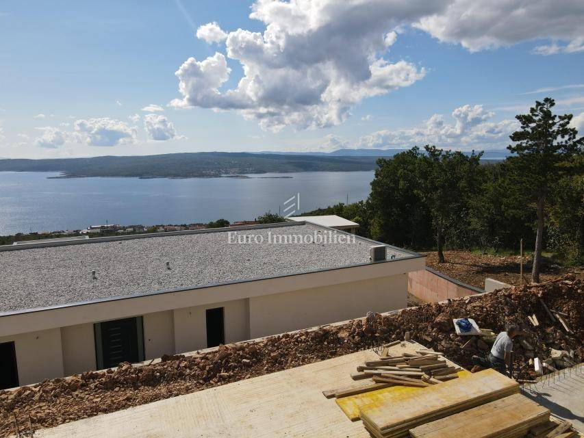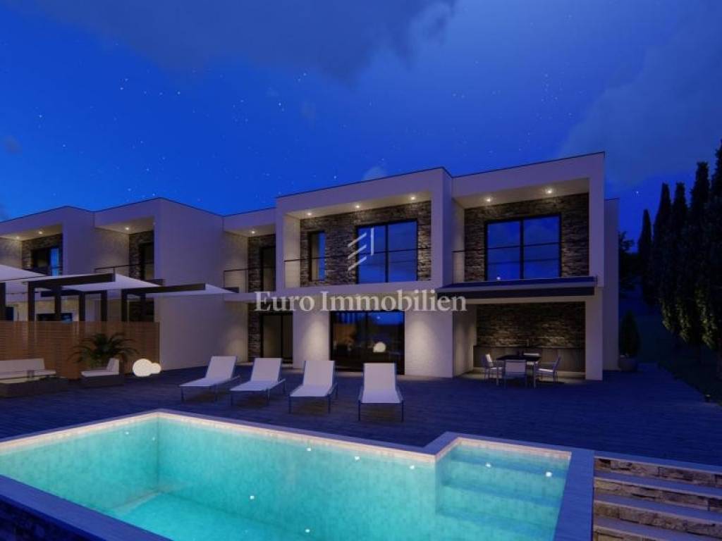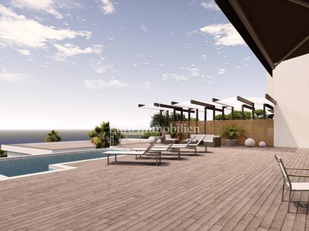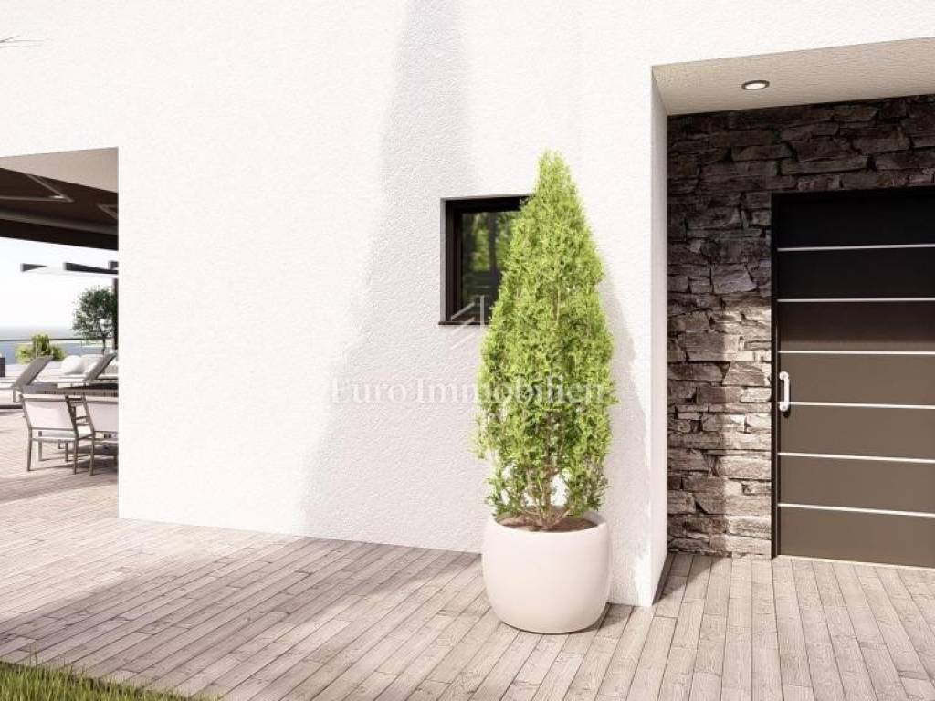 A modern villa for sale with a swimming pool and a panoramic view of the sea, located in a quiet place above Crikvenica, surrounded by nature in the neighborhood of modern villas.