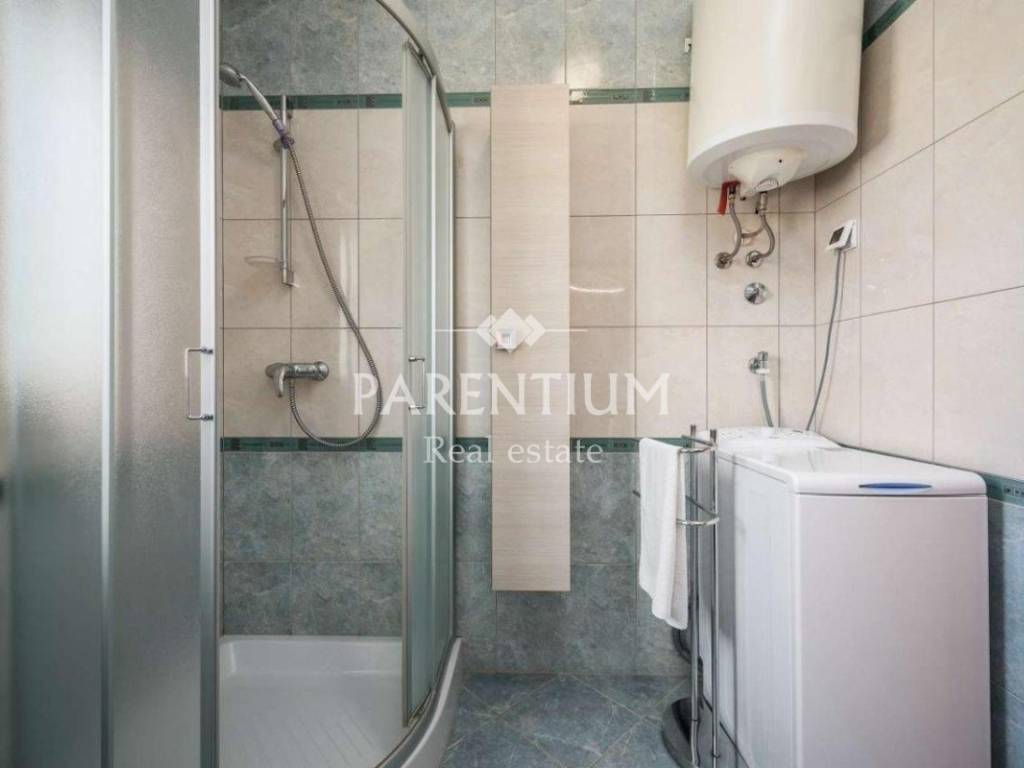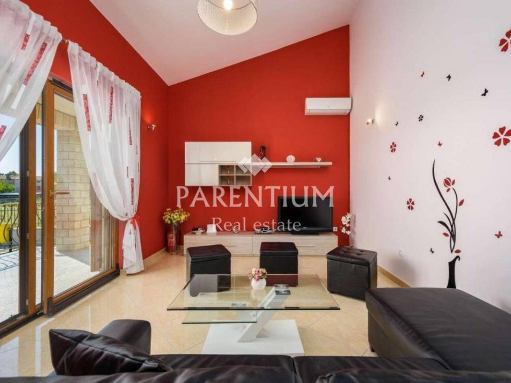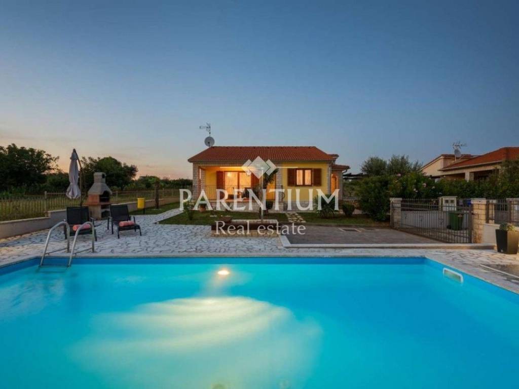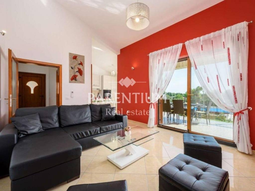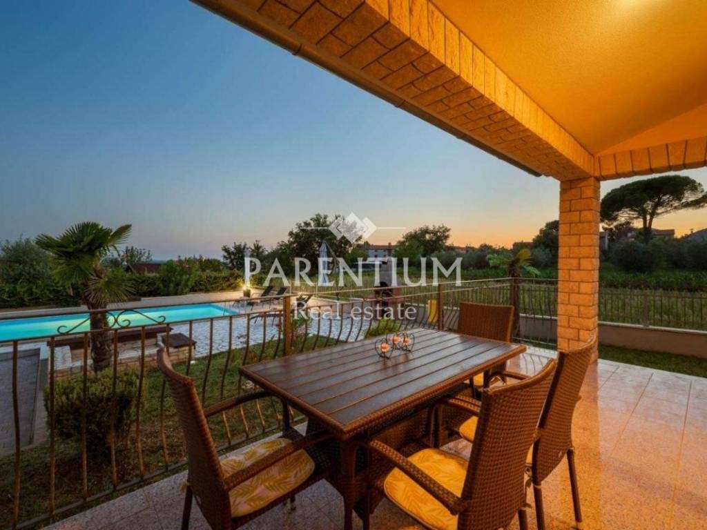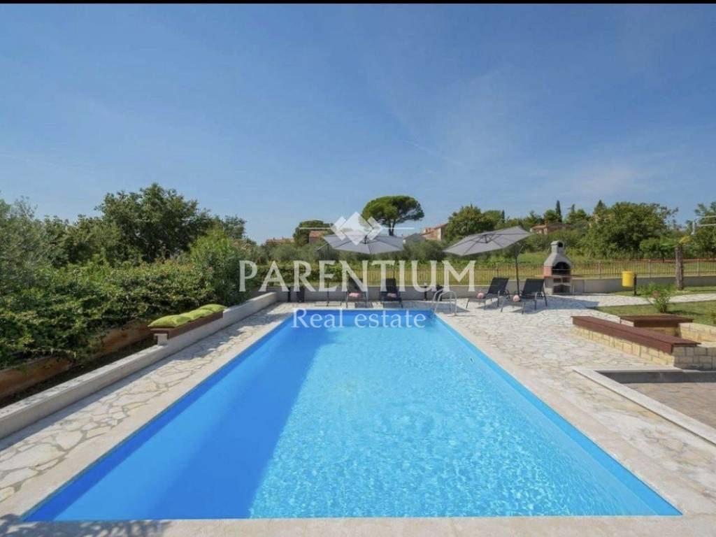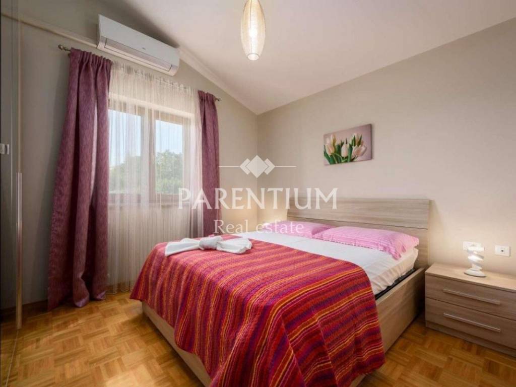 In the vicinity of Porec, a house for sale, ground floor with a total area of 110m2. It is located on a plot of 776m2, which has a swimming pool of 32m2 and a beautiful beach with a covered terrace. The house consists of a hallway, living room, kitchen, dining room, 2 bedrooms and a bathroom. Air conditioners are used to heat this detachable ground floor as well as for cooling in the warm summer months.
