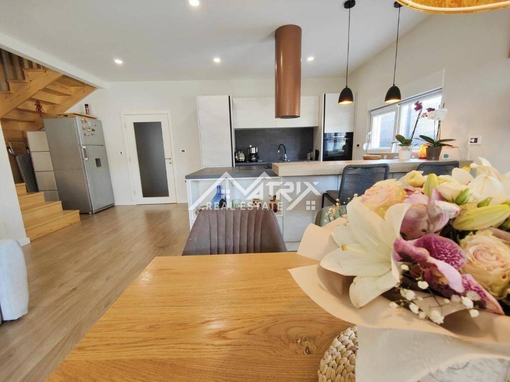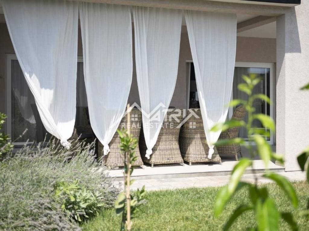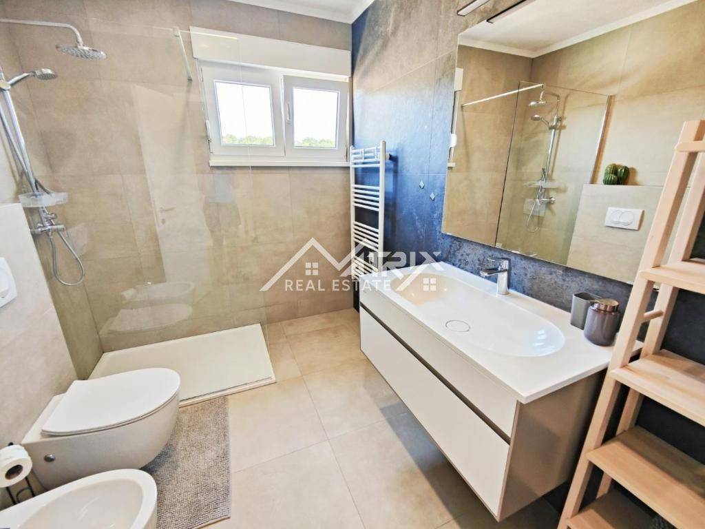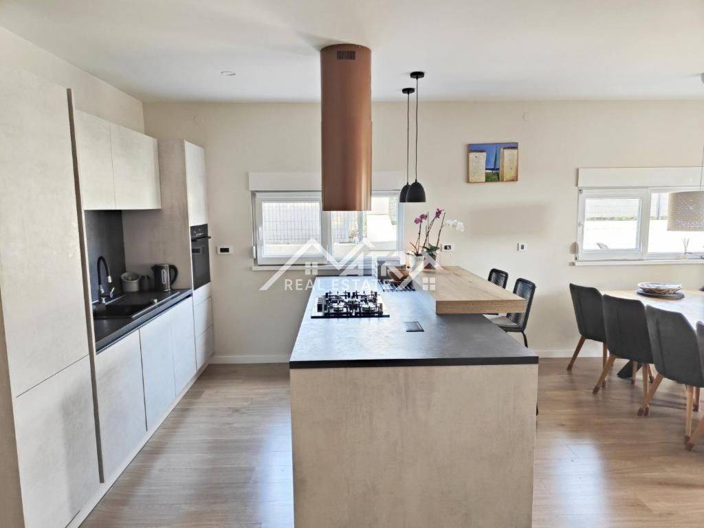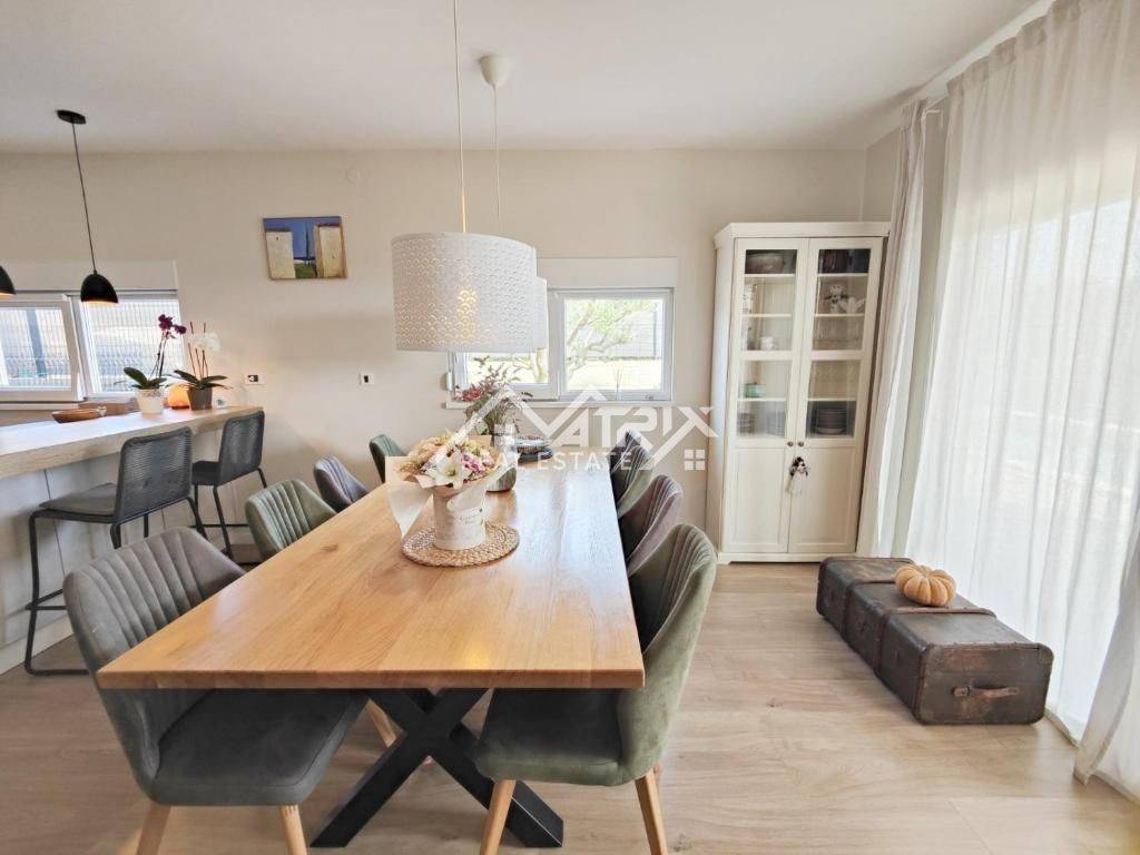 In the quiet residential area of Stancijeta, only 2 km from the center of Novigrad and the sea, a semi-detached house unit built in 2021 is for sale, with a valid occupancy permit. The house is energy-efficient, with a total living area of 180 m², situated on a 480 m² plot. Thanks to its functional layout, landscaped garden and peaceful natural surroundings, the property is ideal for comfortable family living, but also represents an excellent investment opportunity for tourist rental.