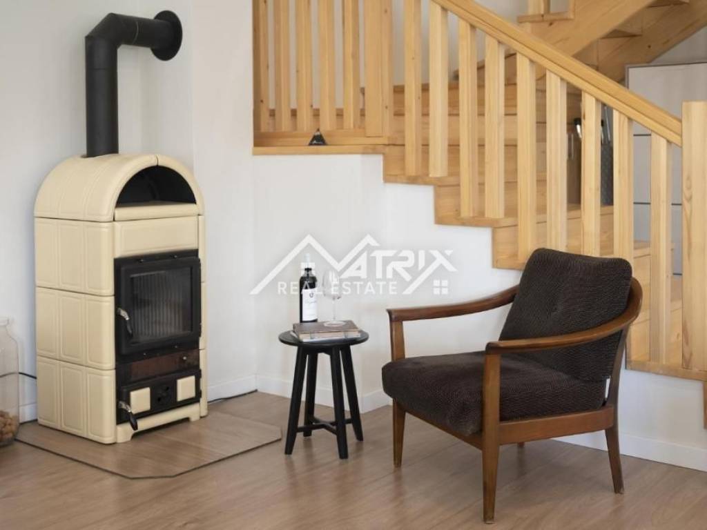 Upon entering the house there is a hallway and a bathroom equipped with a washing machine and dryer, which is very practical for everyday use. Next to the entrance door there is also access to a storage room of approximately 12 m², providing additional storage space. The ground floor continues into a spacious open-plan area consisting of a kitchen, dining area and living room. Large glass walls provide plenty of natural light and lead to a terrace and landscaped garden with a swimming pool, creating a perfect space for relaxation and outdoor living. Heating and cooling are provided by air conditioning units, while a wood-burning stove in the living room offers additional warmth and a cozy atmosphere during the winter months.