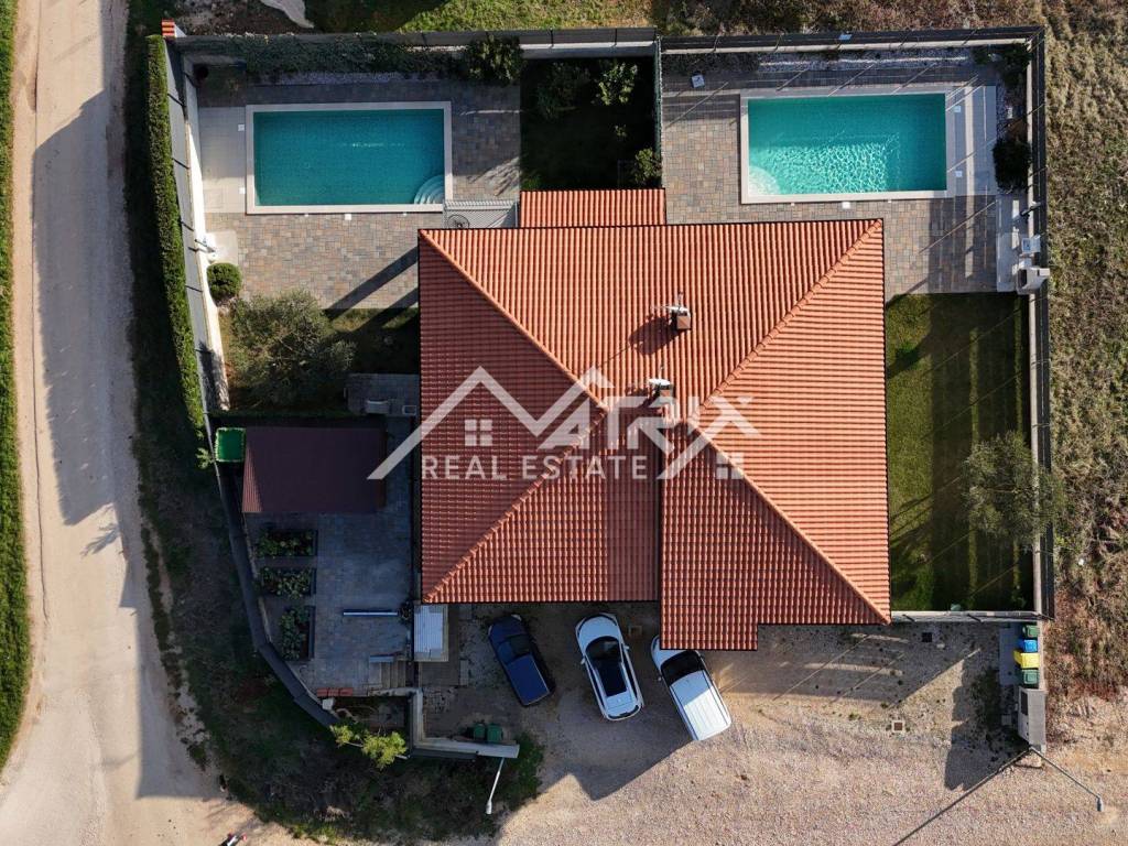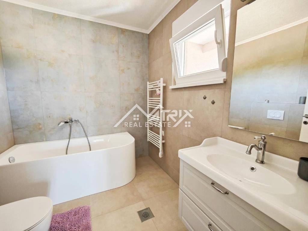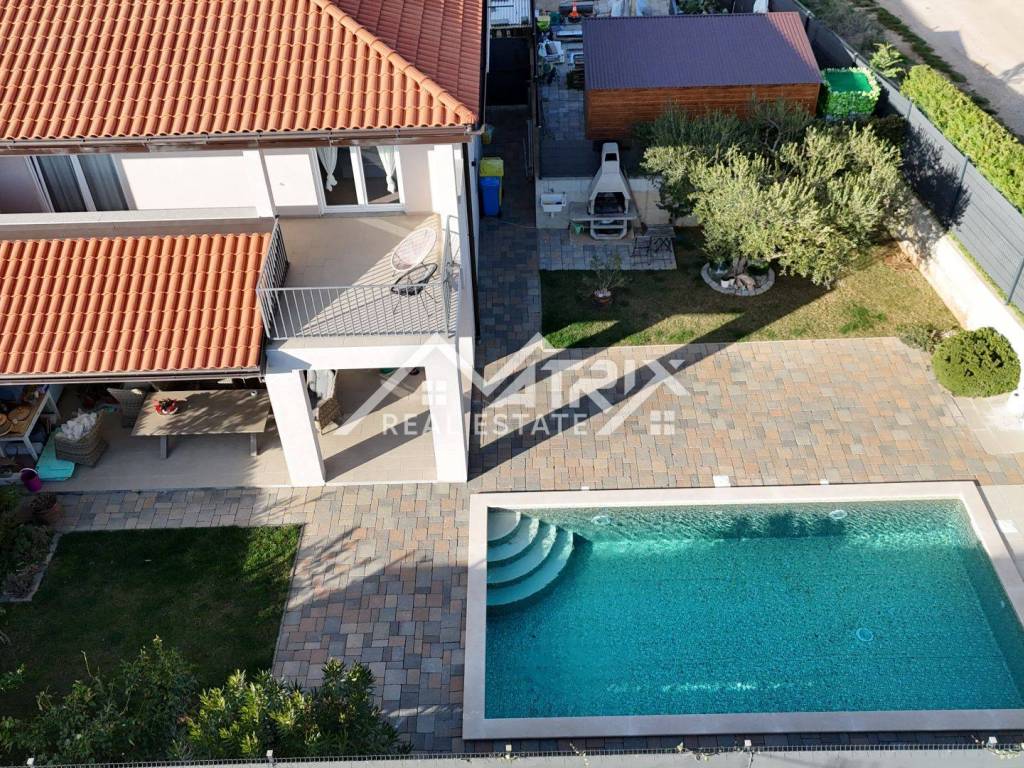 The garden is fully fenced and beautifully landscaped, providing a high level of privacy. The outdoor area features a 32 m² swimming pool with electrolysis and automatic dosing, with preparation for installing a heat pump. Additional highlights of the property include an outdoor barbecue area, automatic irrigation system, an old olive tree, citrus trees, three large vegetable garden beds and a garden house of 15 m².