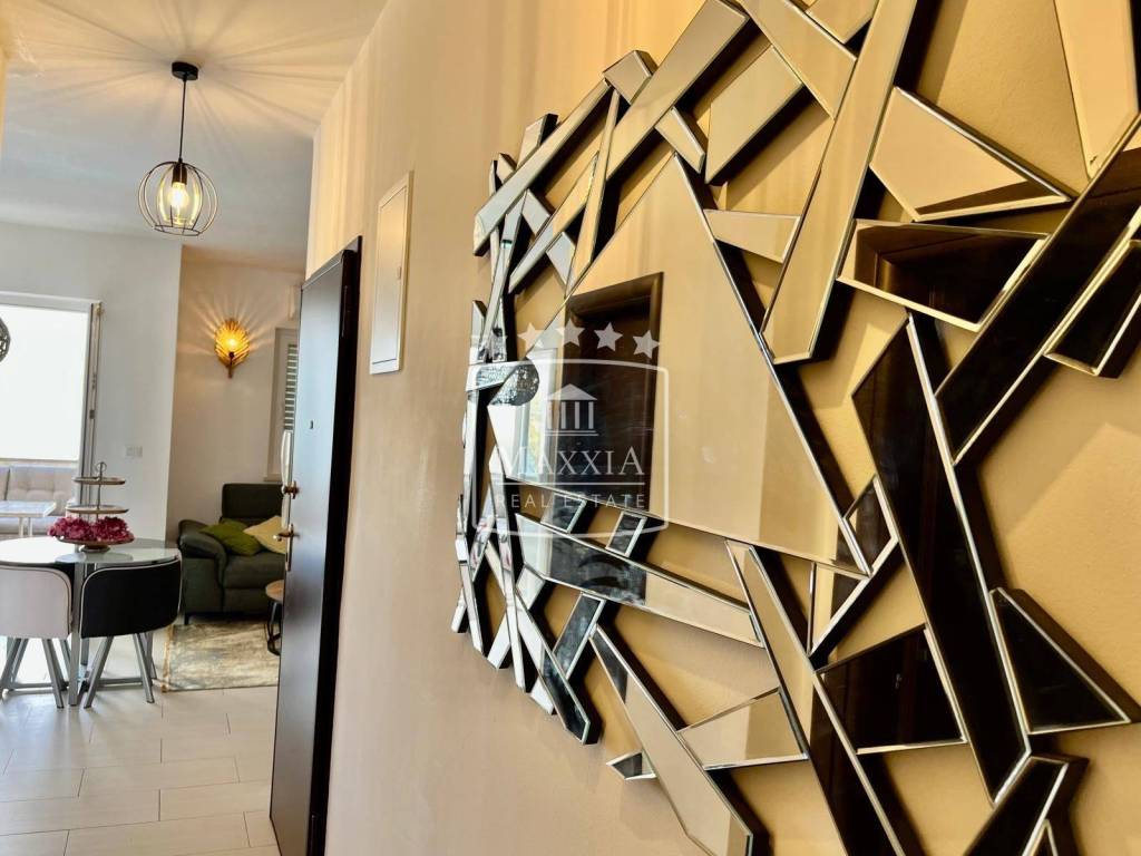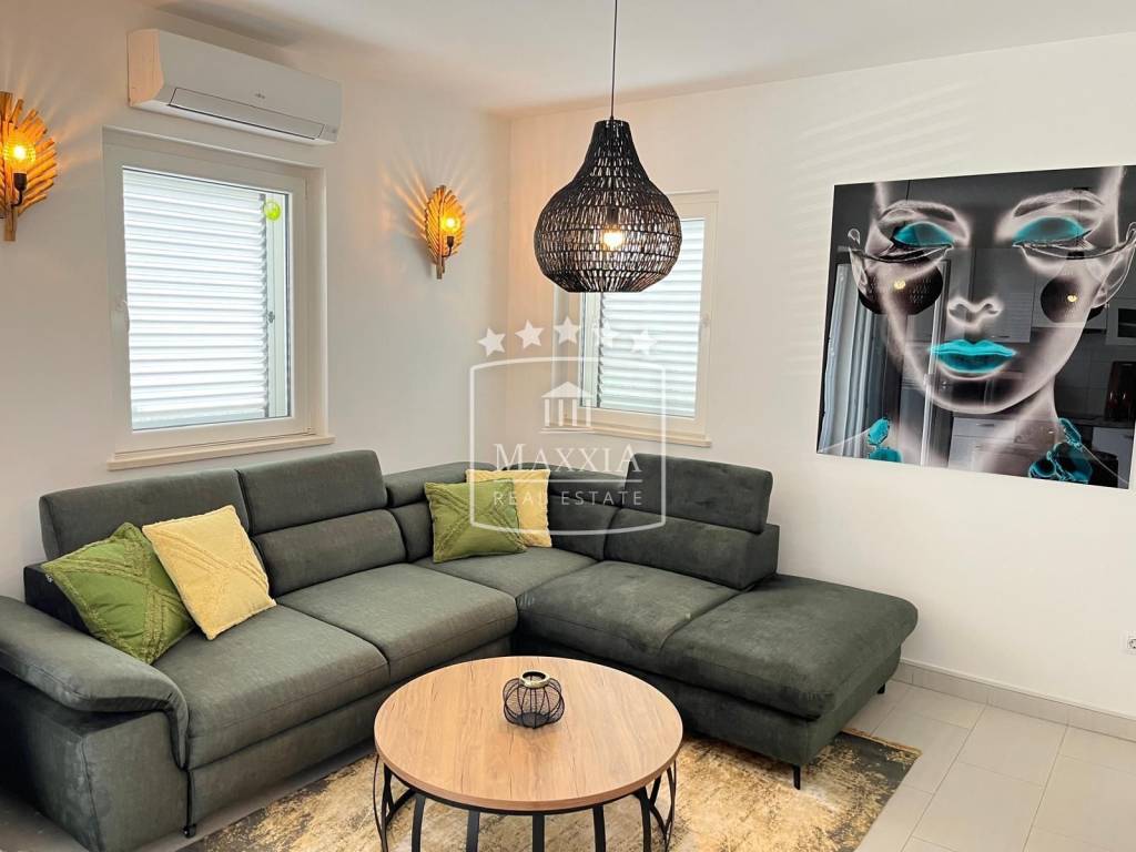The apartment is situated on the ground floor and has a total area of 60.90 m² including a balcony. It is sold fully furnished and equipped, carefully designed and ready for immediate move-in or tourist rental. Layout: - kitchen with living room and access to the balcony - two bedrooms - bathroom with toilet - balcony with sea view