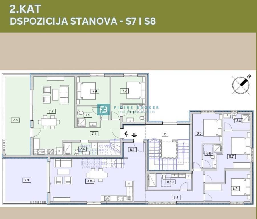 Apartment S8 with a total usable area of 144.69 m2 (living area 117.58 m2 + terrace 19.80 m2 + roof terrace 56.84 m2 + parking) is located on the 2nd floor. It consists of