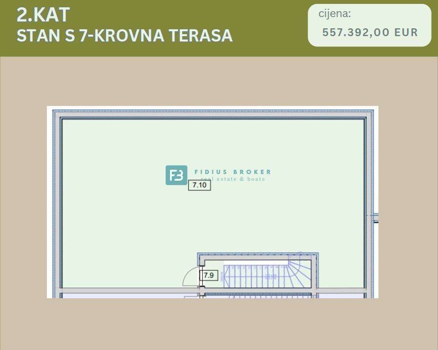 Apartment S7 with a total usable area of 126.68 m2 (living area 85.82 m2 + terrace 21.45 m2 + roof terrace 108.52 m2 + parking) is located on the 2nd floor. It consists of a hallway, entrance hall, three bathrooms, two bedrooms, kitchen with dining room, living room with access to a beautiful covered terrace of 21.45 m2 with a beautiful view of the sea. An internal staircase leads to an uncovered roof terrace of 108.52 m2 with a beautiful panoramic view of the sea and the city. The apartment has 1 parking space.