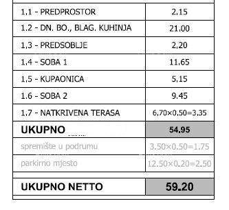 The apartment, with an area of 54.95 m2, is located on the 3rd floor and consists of: a hallway, a living room with a kitchen and dining area, two bedrooms, a bathroom, and a terrace. The apartment also includes a storage room in the basement of the building measuring 3.50 m2 and an outdoor parking space of 12.50 m2.