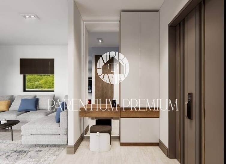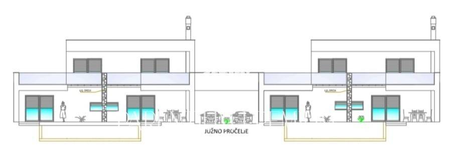 The concept of the house is extremely innovative and will spread over 2 floors with interesting content. On the ground floor, there will be an open space living room with a dining room and a kitchen, from which you will be able to directly enter the heated swimming pool, which will be partly covered with a wooden pergola and surrounded by two covered terraces and a sunbathing area. On this floor, there is a master bedroom with its own bathroom and wardrobe, a laundry room, a guest toilet and a boiler room on the outside. Upstairs we have 2 bedrooms with their own bathrooms and covered terraces, and another large terrace intended for placing a Jacuzzi and another sunbathing area for undisturbed enjoyment and absorption of the sun's rays.