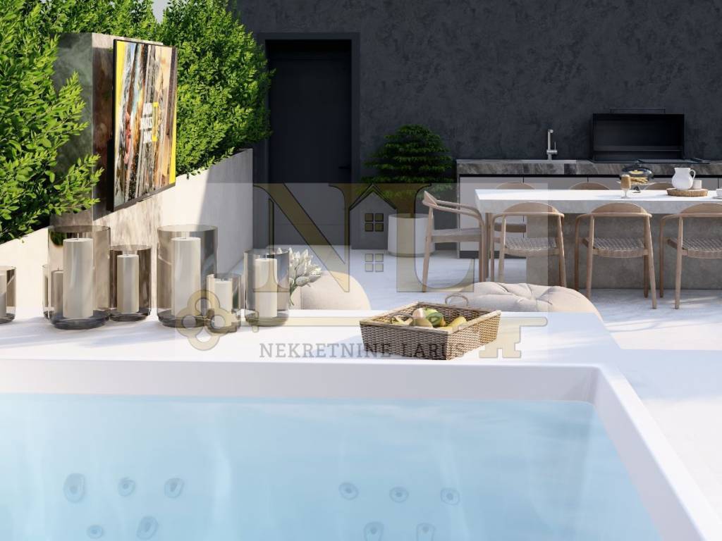 The building is located in a central location in Okrug Gornji with excellent access and a beautiful view of the sea, and all apartments have spacious south-facing balconies. The building is located 500 meters from the sea and the beach. The building has 8 apartments and 13 outdoor parking spaces, and has an elevator and a large communal pool. Penthouse apartment S8 with a roof terrace is located on the third floor of the building and consists of two bedrooms, two bathrooms, a living room with a kitchen and a terrace and a large roof terrace with a panoramic view of the sea and nearby islands. The apartment has two outdoor parking spaces. Surfaces: Interior area of the apartment: 55.46 m2 Terrace: 14.63 m2 Roof terrace: 70.40 m2 Total floor area: 140.49 m2