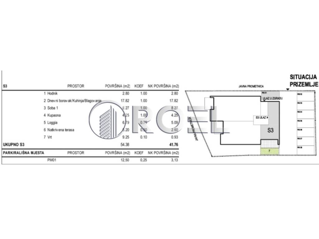 The apartment offers a total net usable area of 41.76 m and features a well-designed layout including an entrance hallway, an open-plan living room with kitchen and dining area, one bedroom, a bathroom, a loggia, a covered terrace, and a private garden that provides additional comfort and privacy.